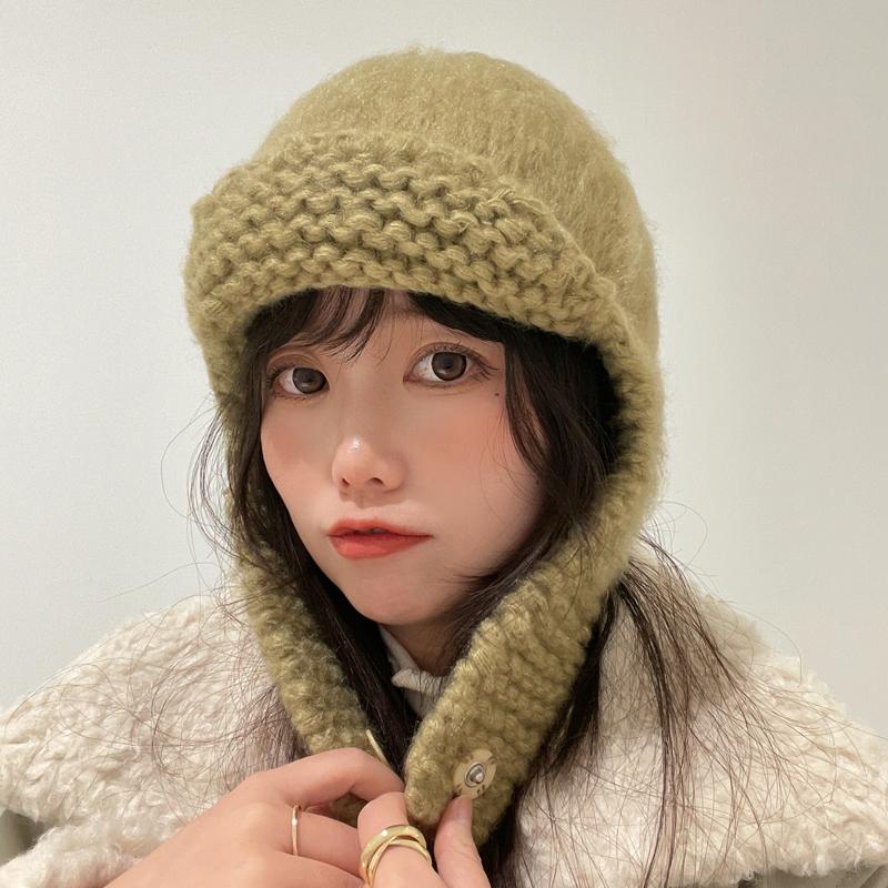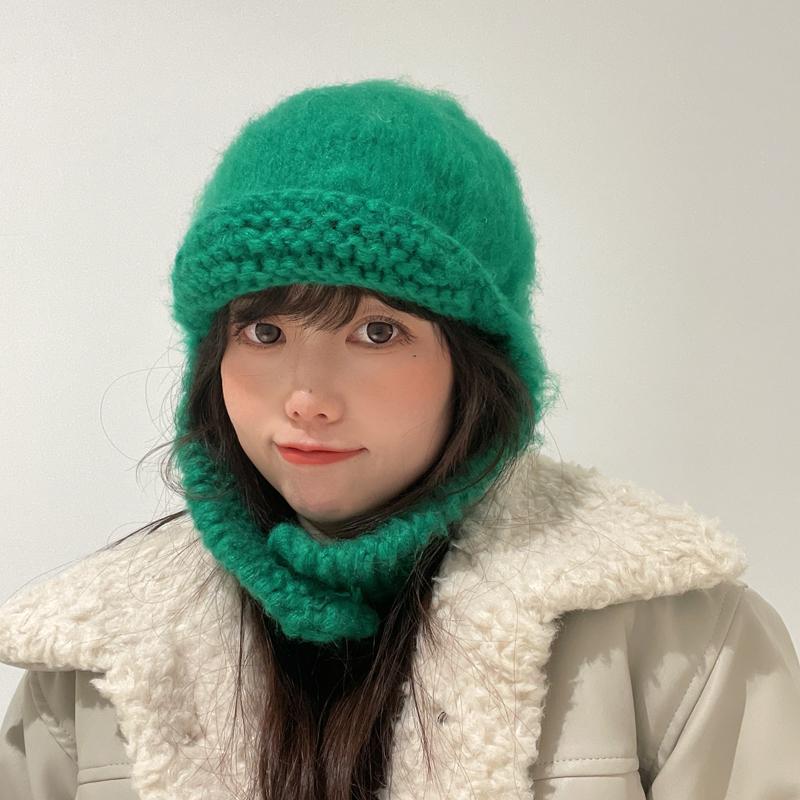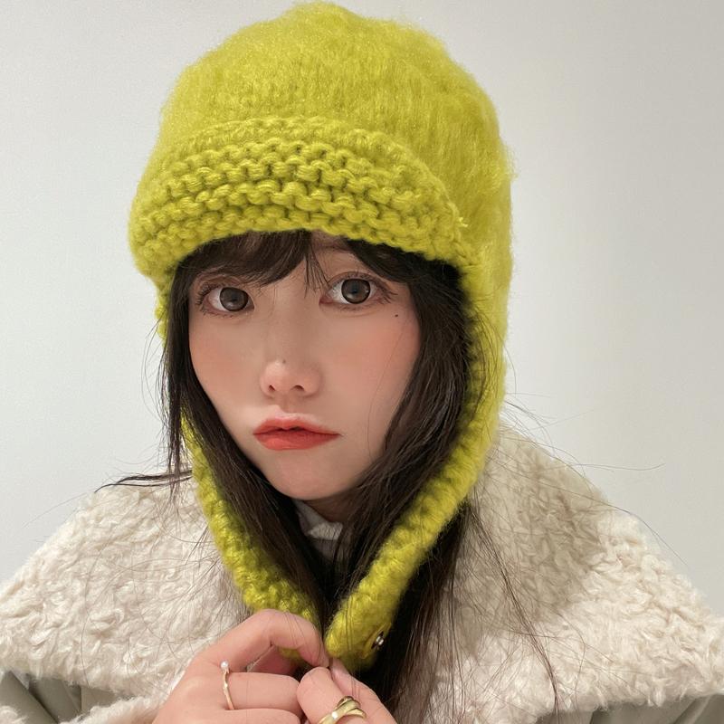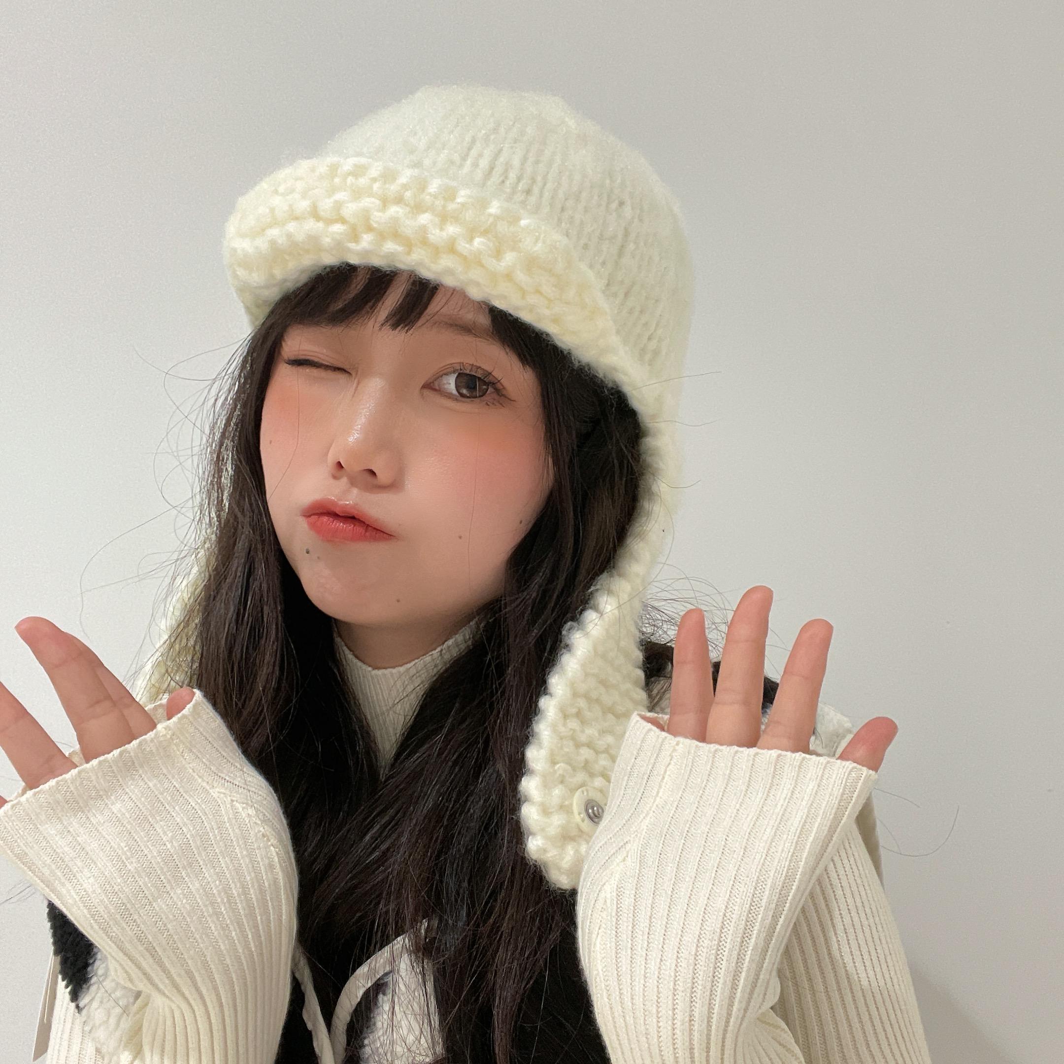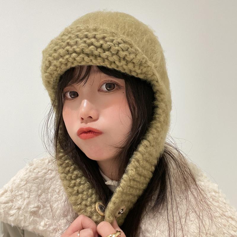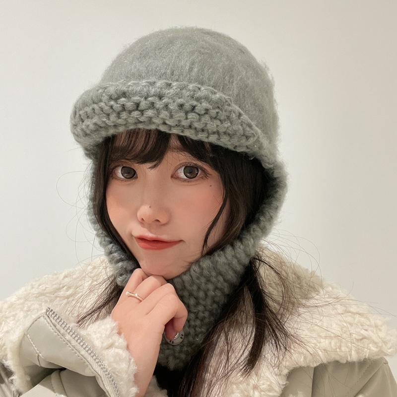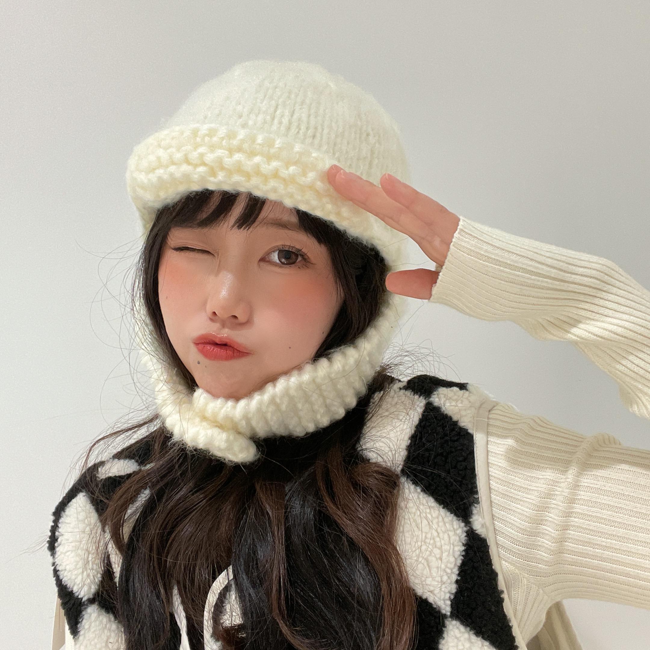 Gorro de Lana Crochet Hecho a Mano Coreano para Mujer con Bufanda Protectora para las Orejas de Una Pieza Retro Tejido Gorro de Punta Invierno Cálido Sombrero Volador