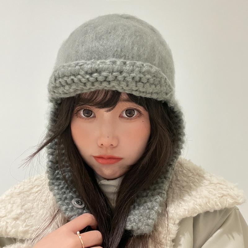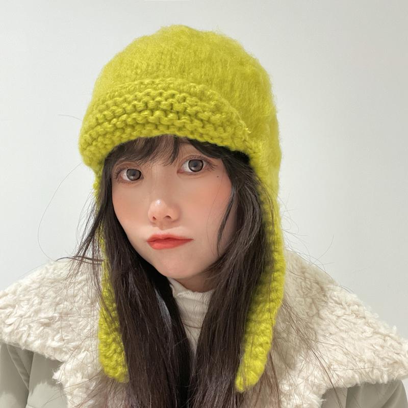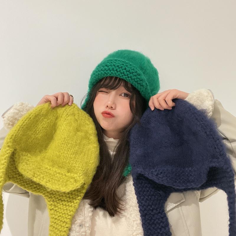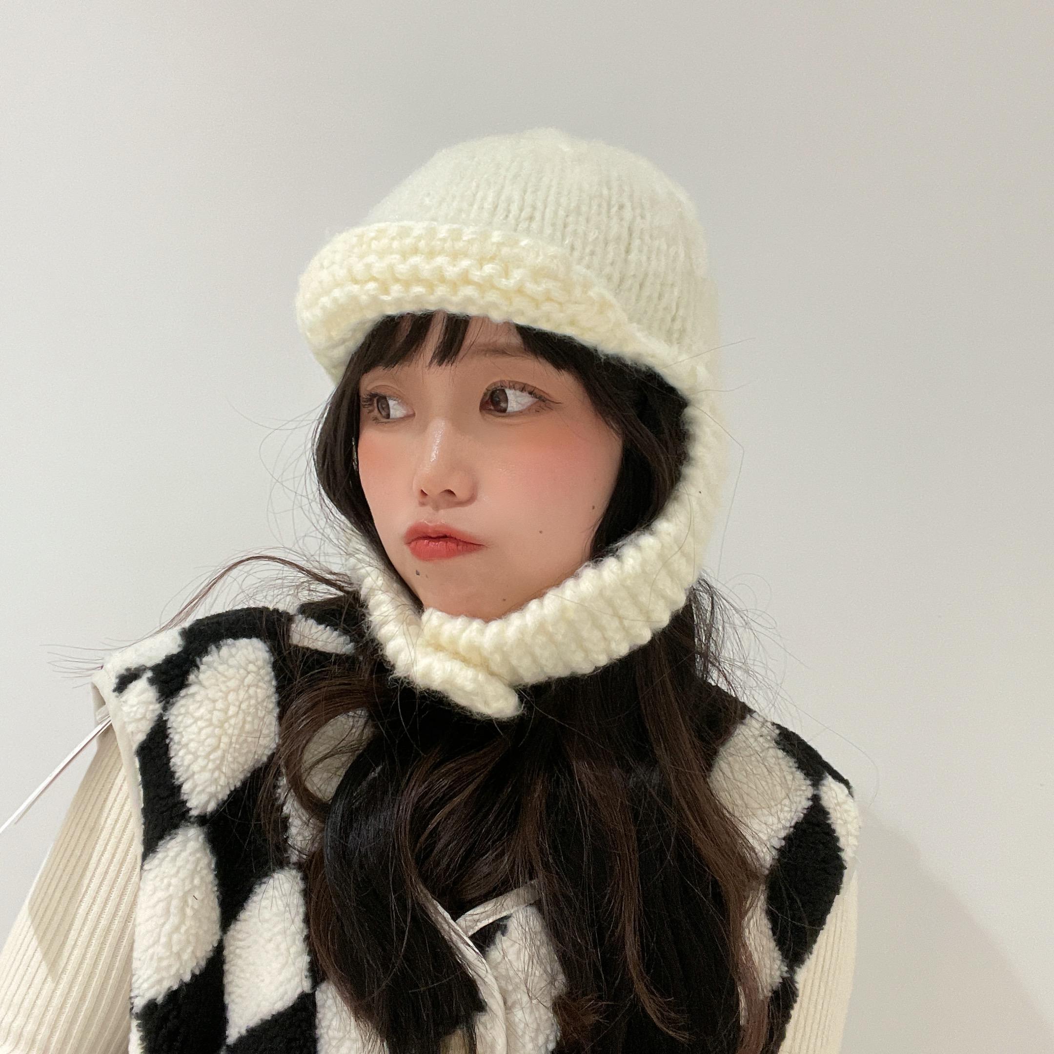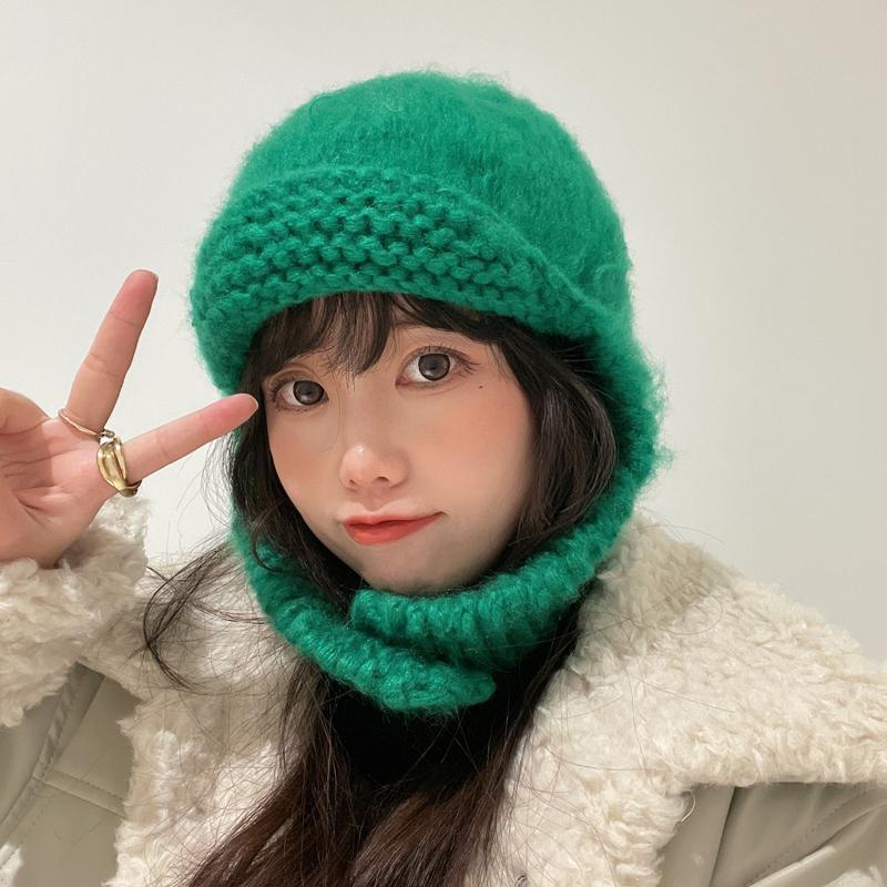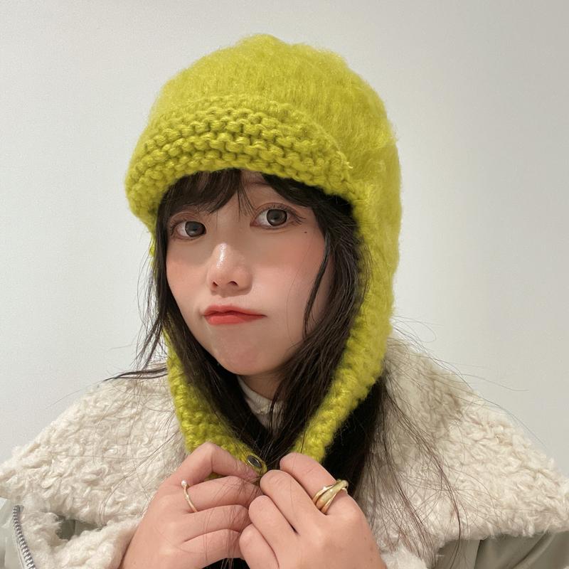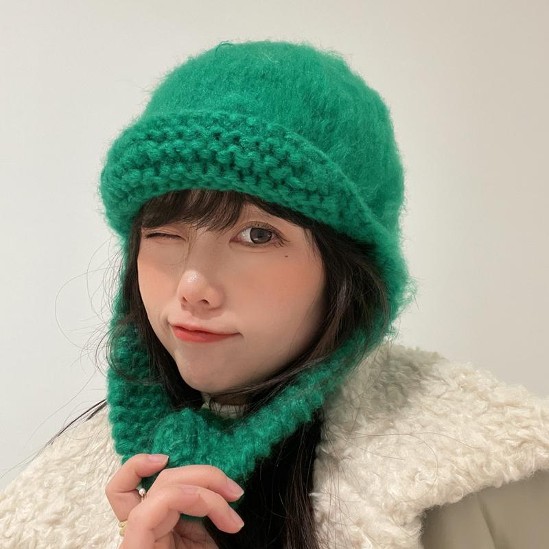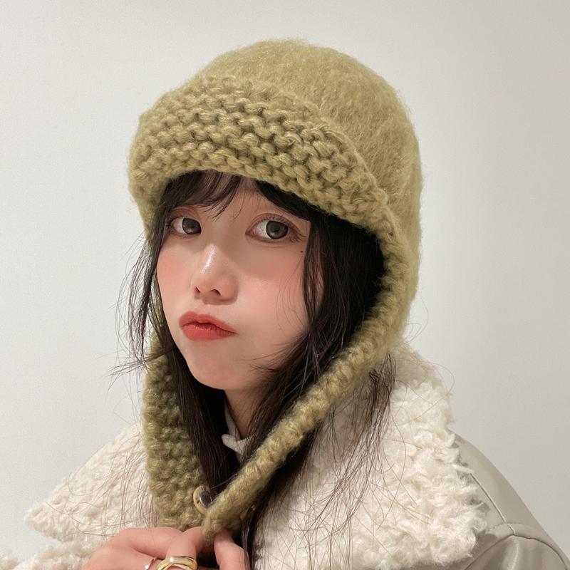 Gorro de Lana Crochet Hecho a Mano Coreano para Mujer con Bufanda Protectora para las Orejas de Una Pieza Retro Tejido Gorro de Punta Invierno Cálido Sombrero Volador