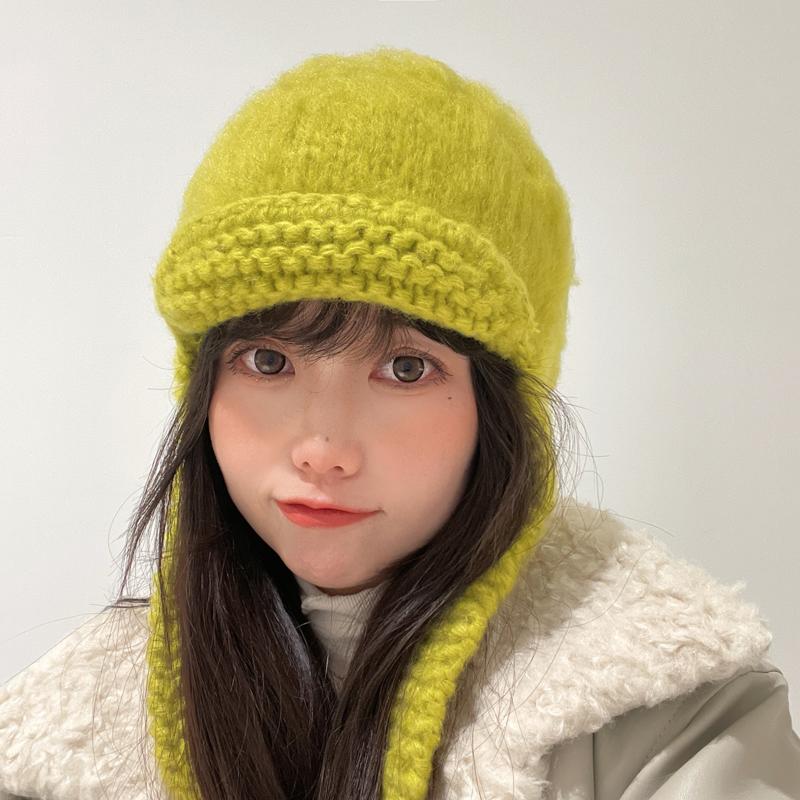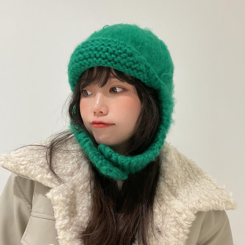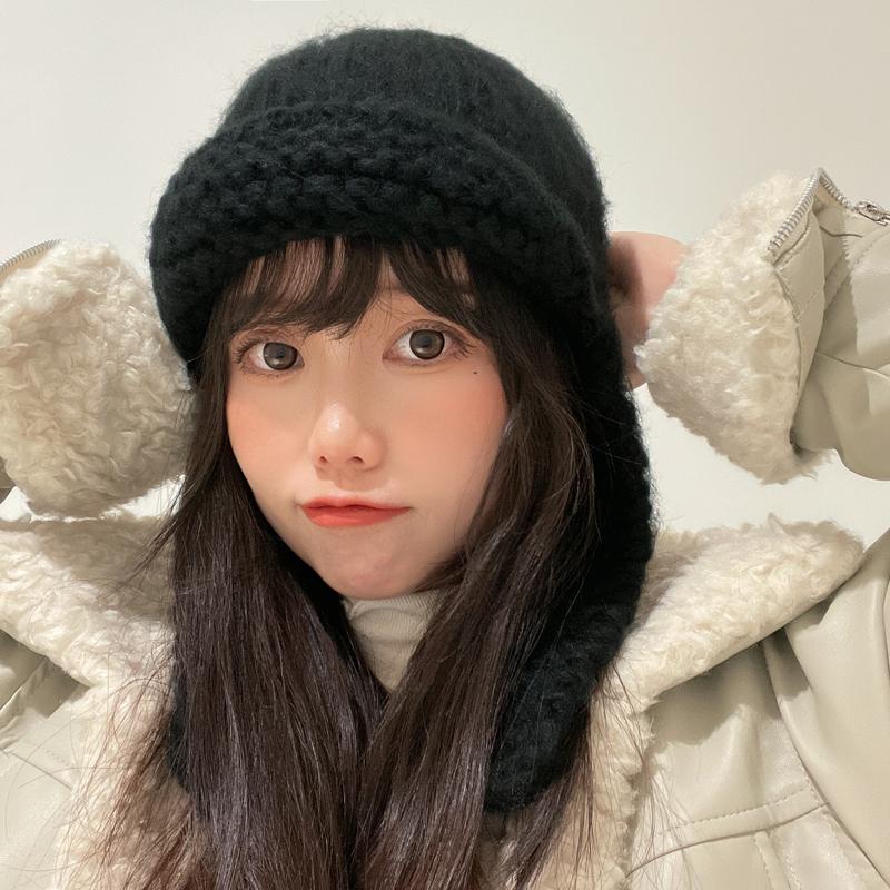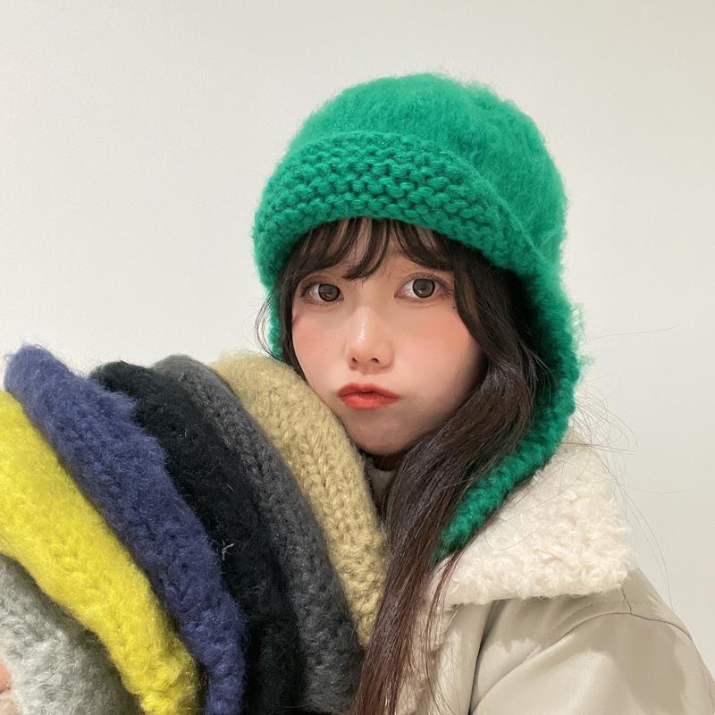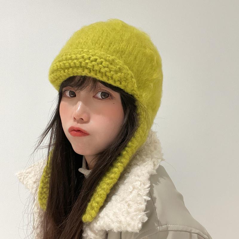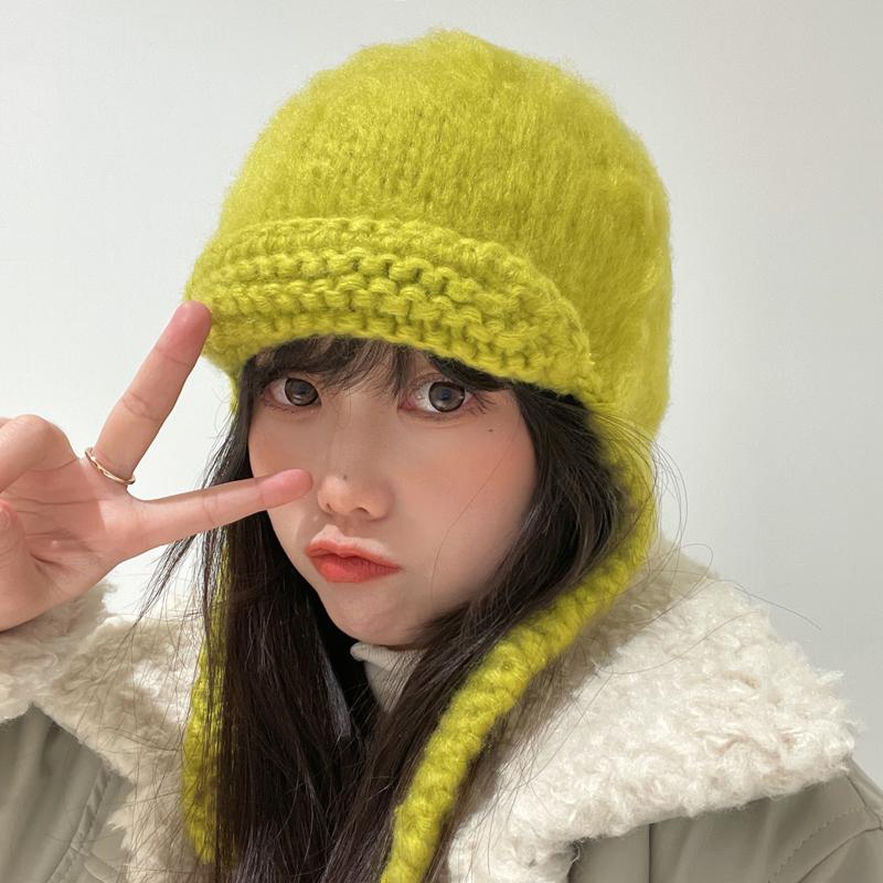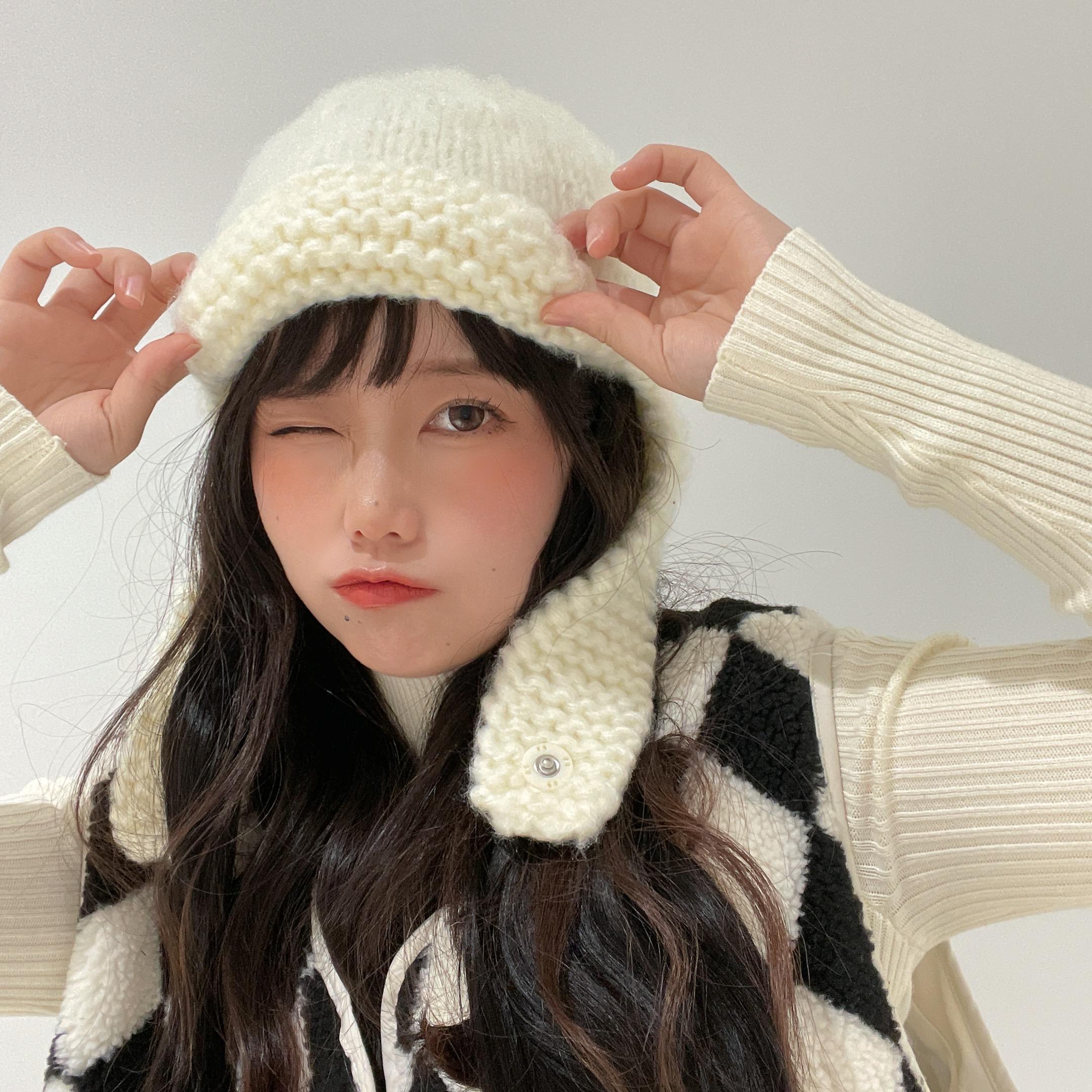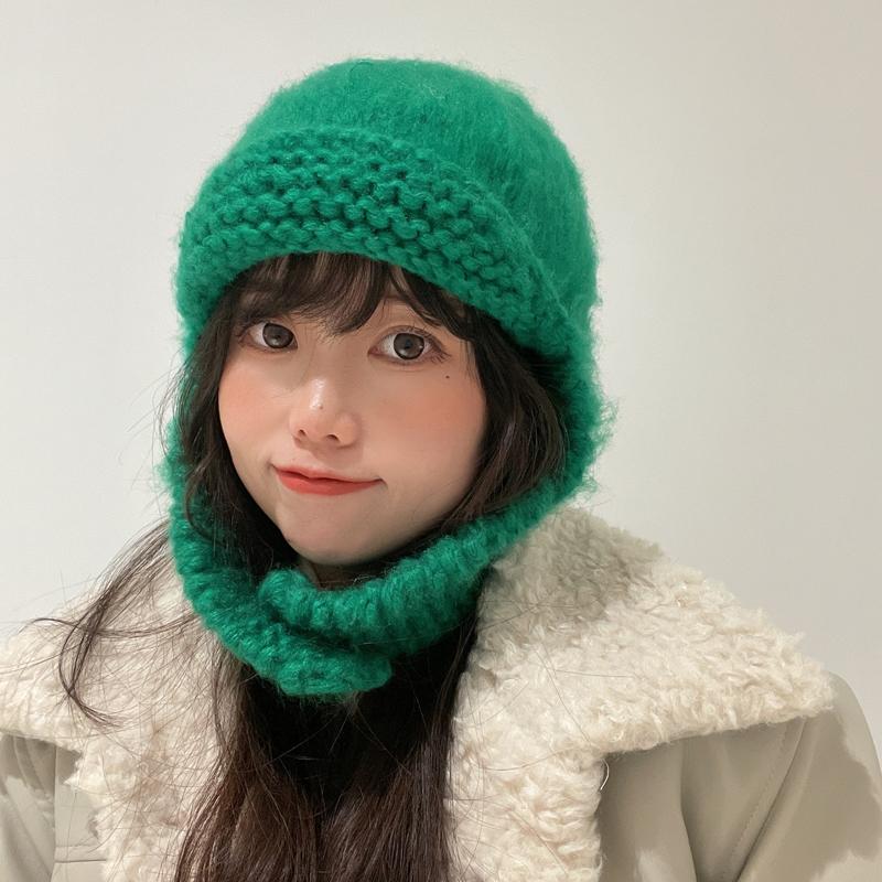 Gorro de Lana Crochet Hecho a Mano Coreano para Mujer con Bufanda Protectora para las Orejas de Una Pieza Retro Tejido Gorro de Punta Invierno Cálido Sombrero Volador