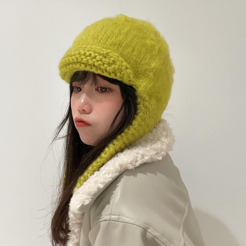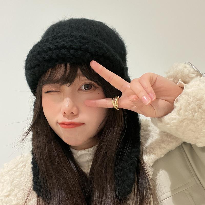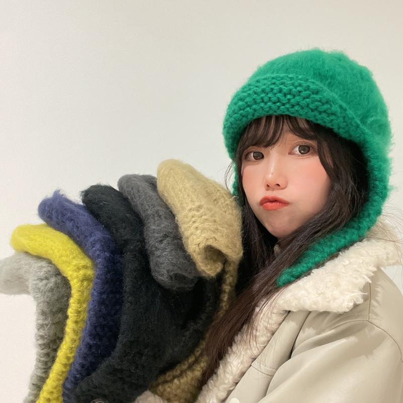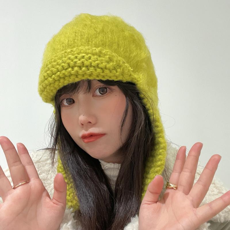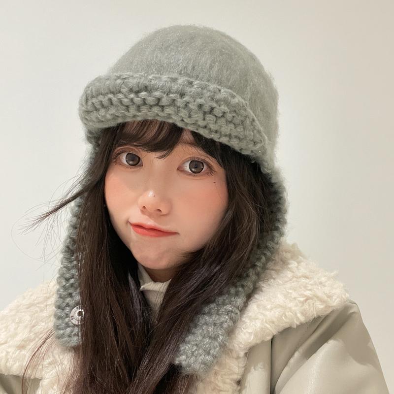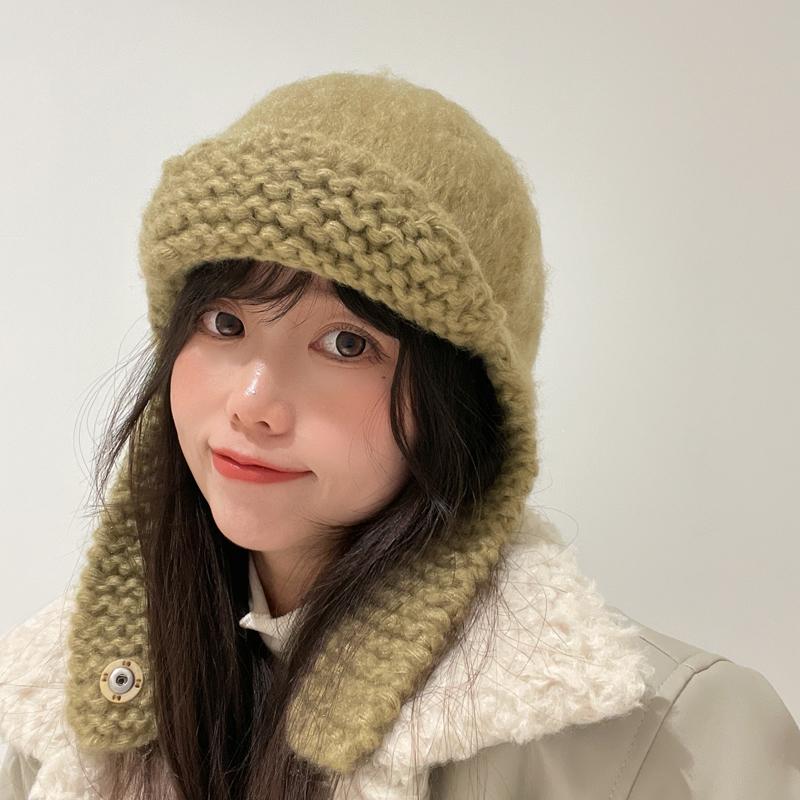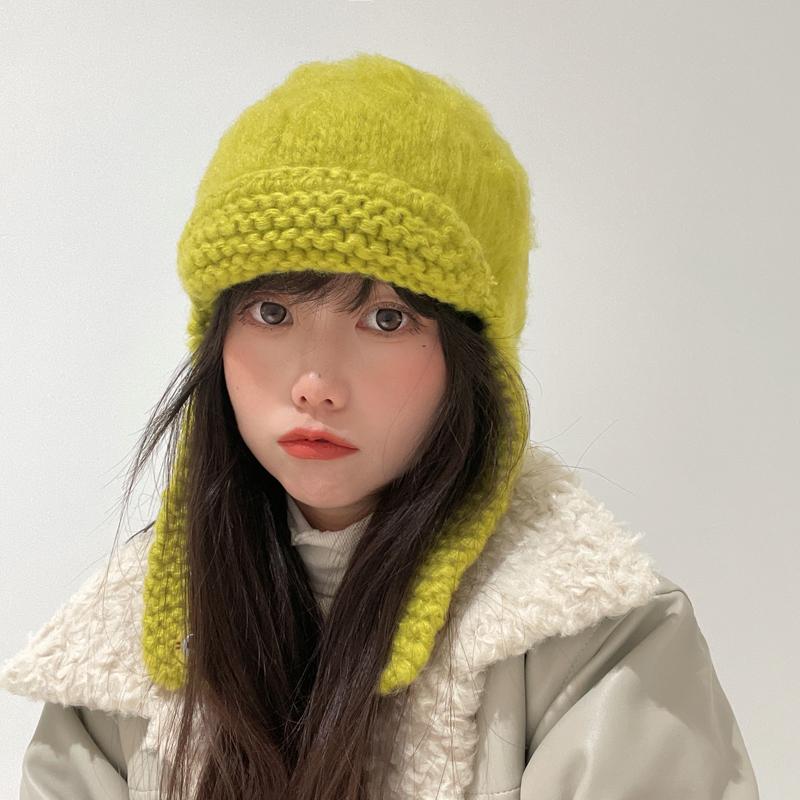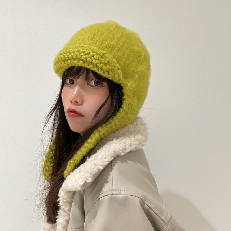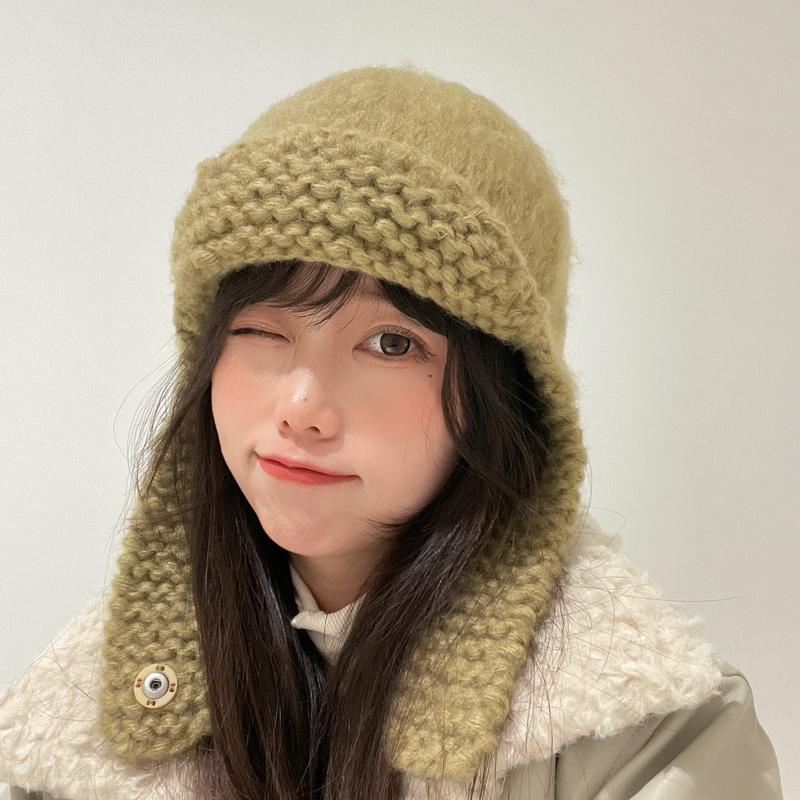 Gorro de Lana Crochet Hecho a Mano Coreano para Mujer con Bufanda Protectora para las Orejas de Una Pieza Retro Tejido Gorro de Punta Invierno Cálido Sombrero Volador