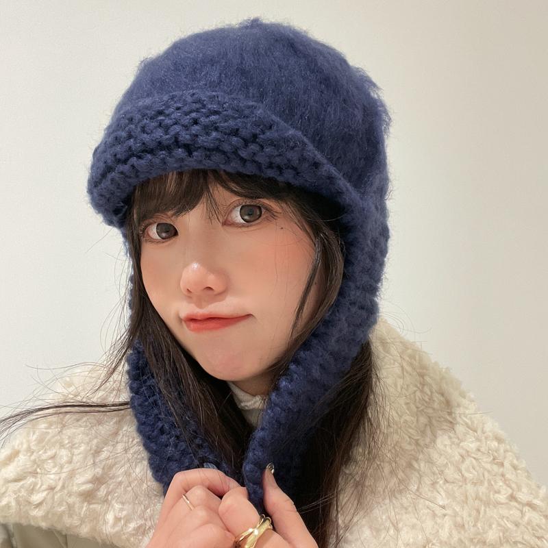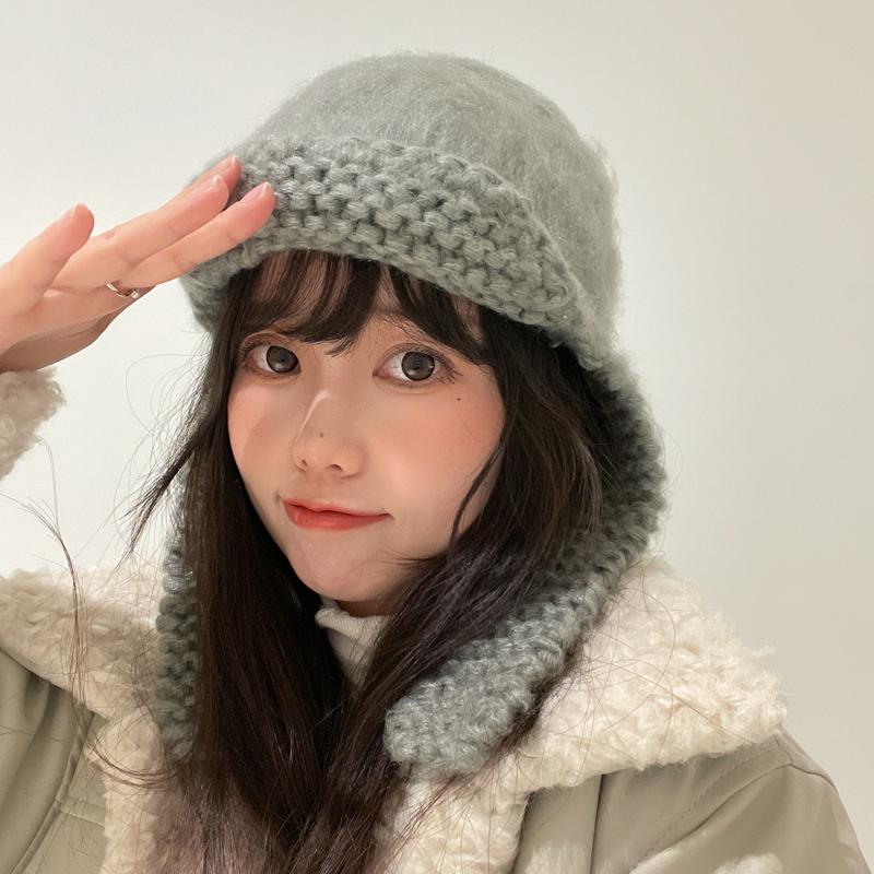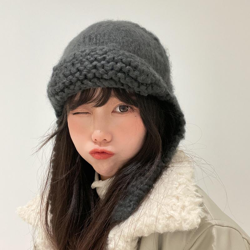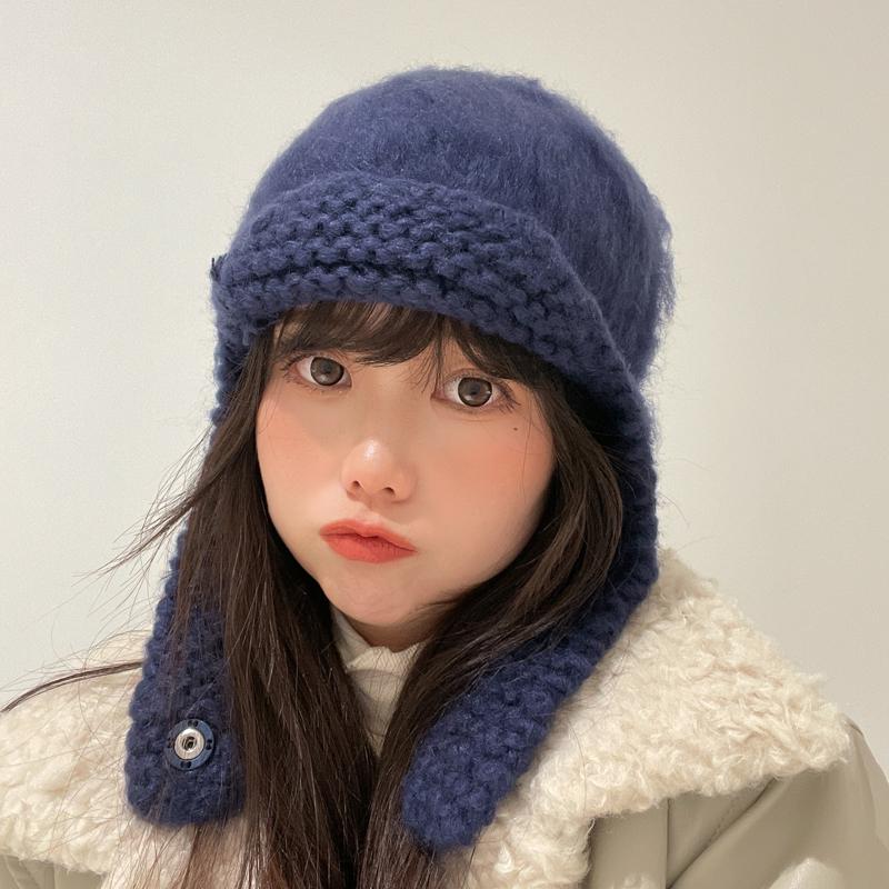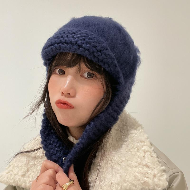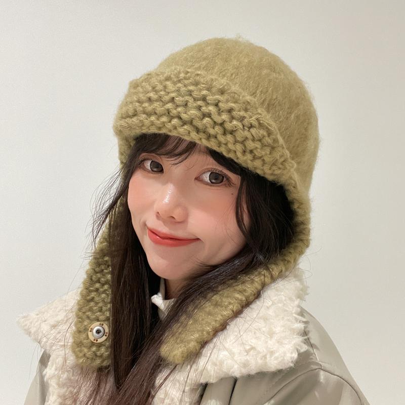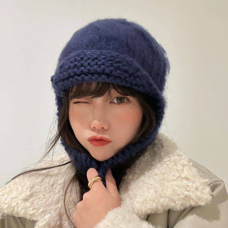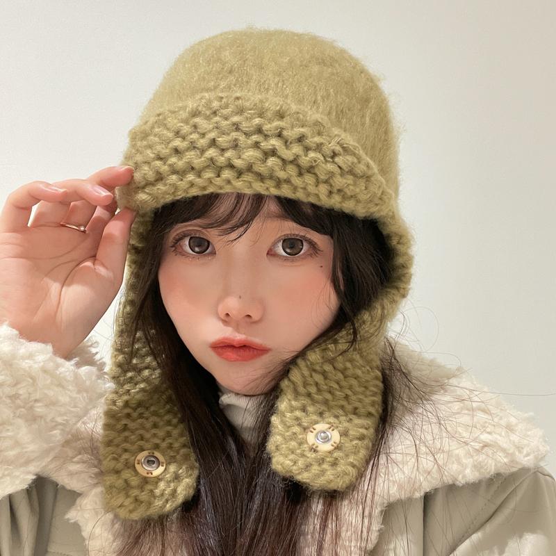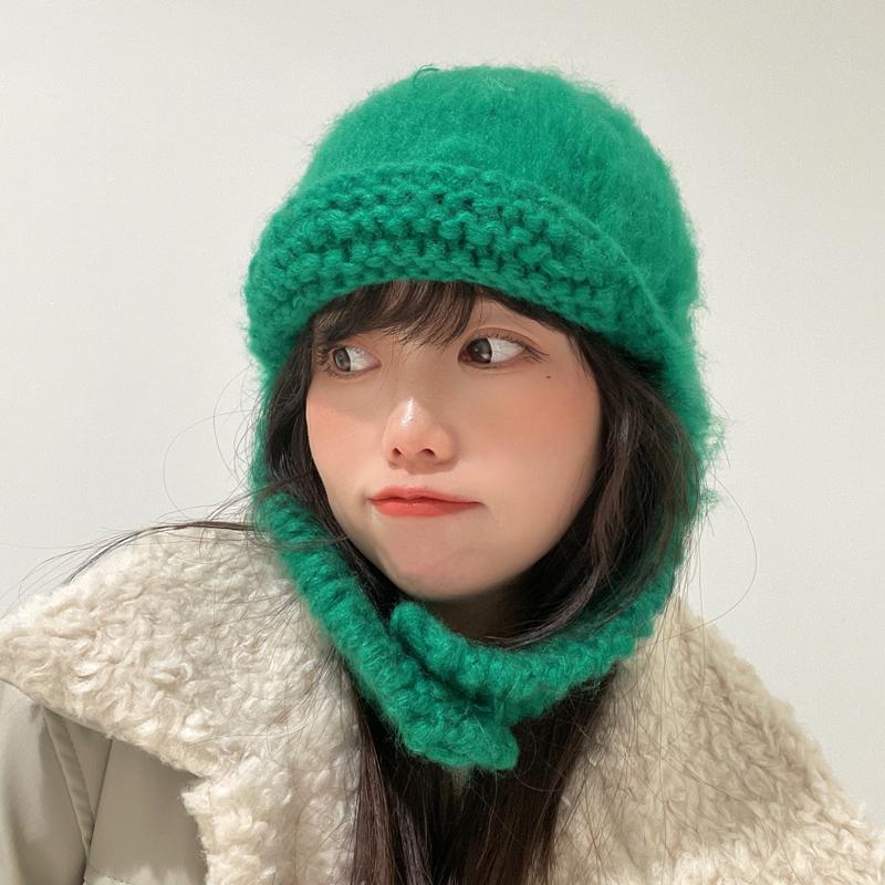 Gorro de Lana Crochet Hecho a Mano Coreano para Mujer con Bufanda Protectora para las Orejas de Una Pieza Retro Tejido Gorro de Punta Invierno Cálido Sombrero Volador