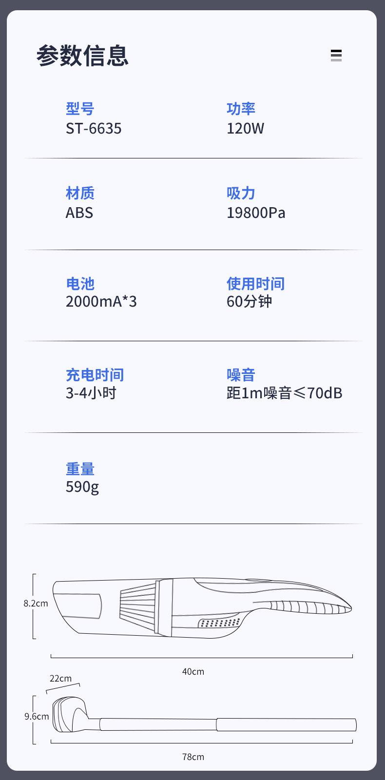 【ST-6635do】Aspiradora inalámbrica-Modelo básico2Festival7,4 VAproximadamente con embalaje:850 gramos