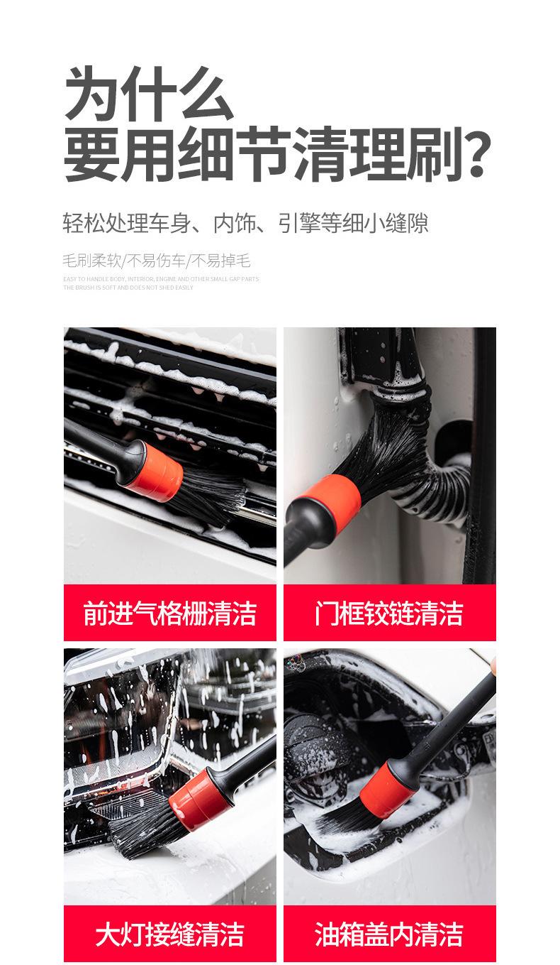 Puede manejar algunos pequeños huecos en la carrocería del coche y limpiar el exterior del motor. Las cerdas son resistentes a ácidos y álcalis. Use cepillos de detalle de diferentes tamaños según las diferentes partes para lograr el efecto de limpieza ideal.