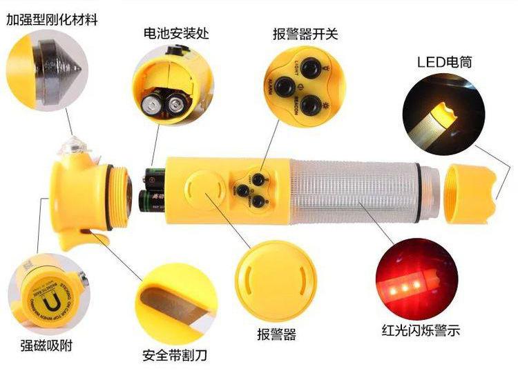 Martillo de seguridad multifuncional cinco en uno, martillo de escape dos en uno, rompe ventanas de coche tres en uno, martillo de vida cuatro en uno