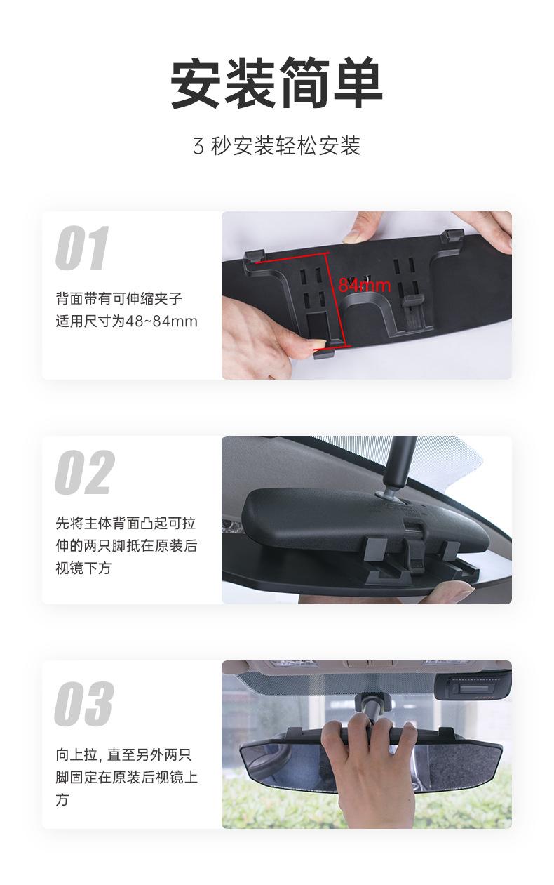 4, Método de instalación B: Primero, coloque los dos pies sobresalientes y extensibles en la parte posterior del cuerpo principal contra la parte superior del espejo retrovisor original, presione el cuerpo principal contra el espejo retrovisor original y tire hacia abajo hasta que los otros dos pies queden fijos debajo del espejo retrovisor original;