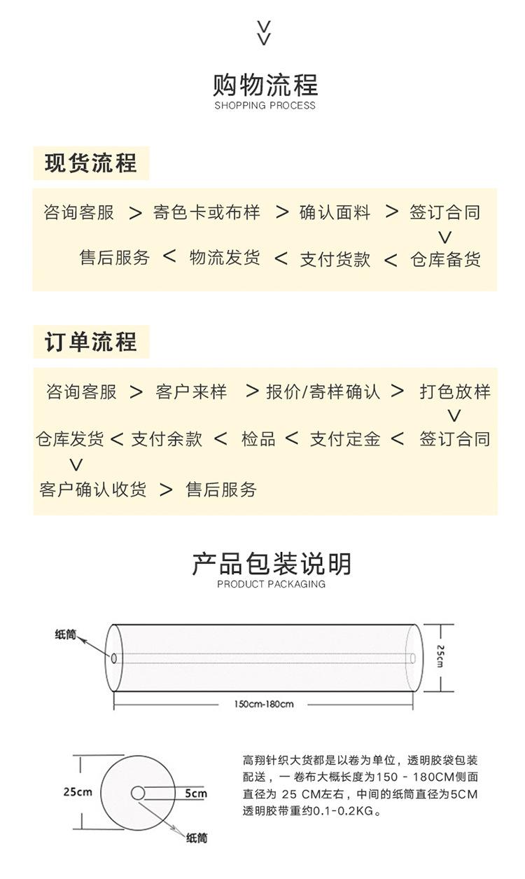 El peso en gramos es el peso de la tela por metro cuadrado, en gramos./Metros cuadrados. Debido a las características de los tejidos de punto, el peso de las prendas grandes será...5%-8%La fluctuación se encuentra dentro de los límites normales y razonables. Por favor, comprenda.