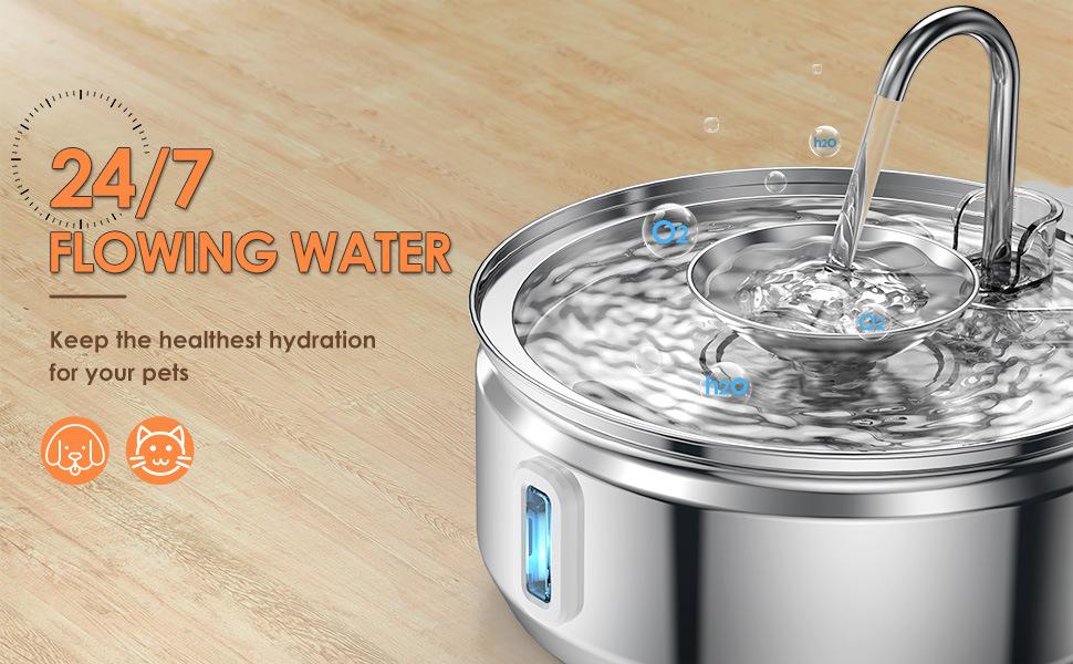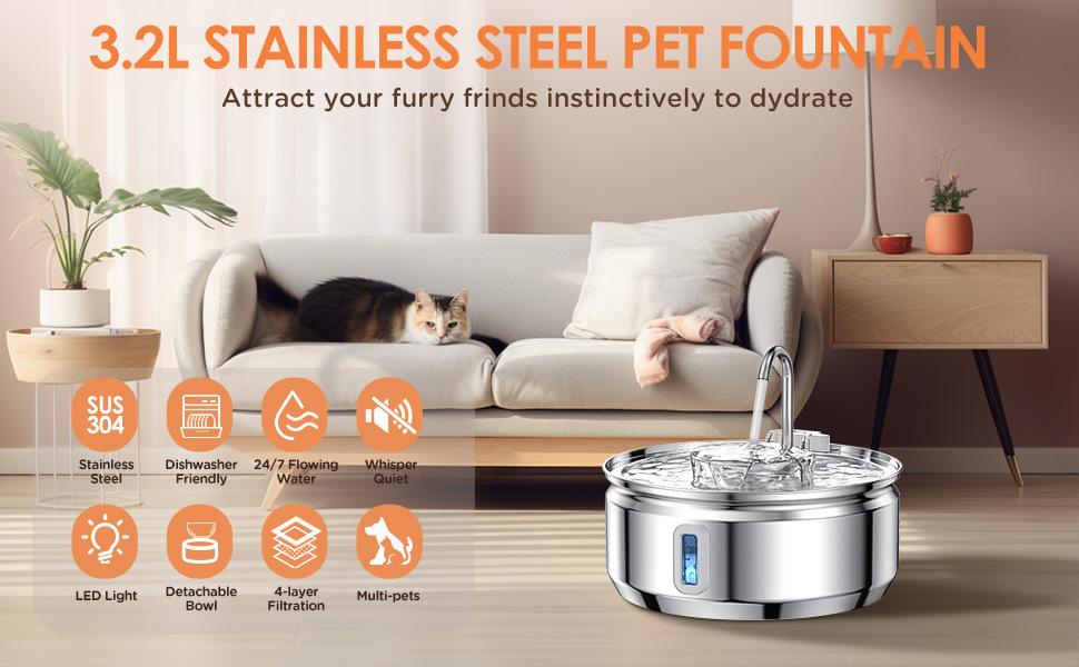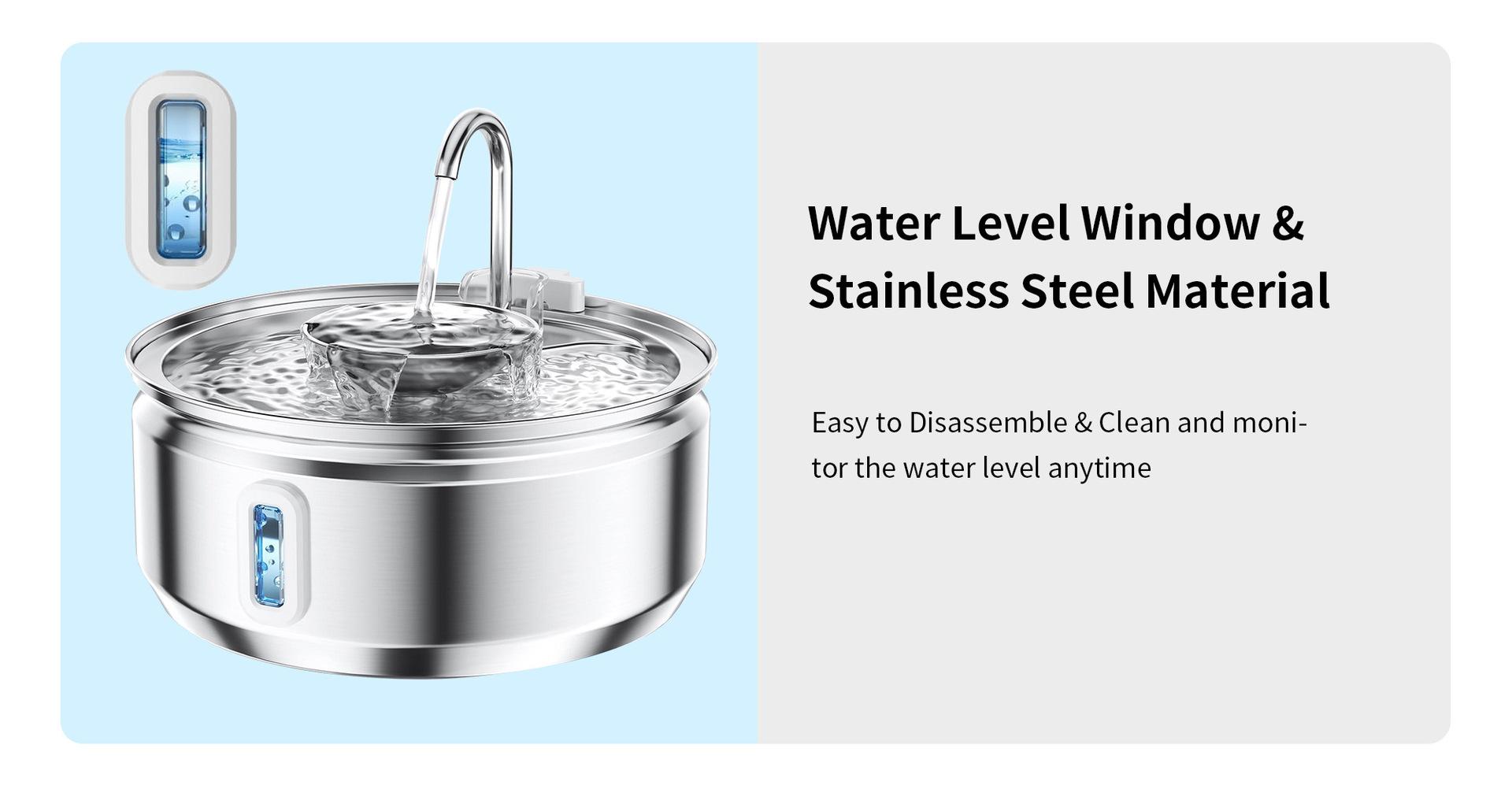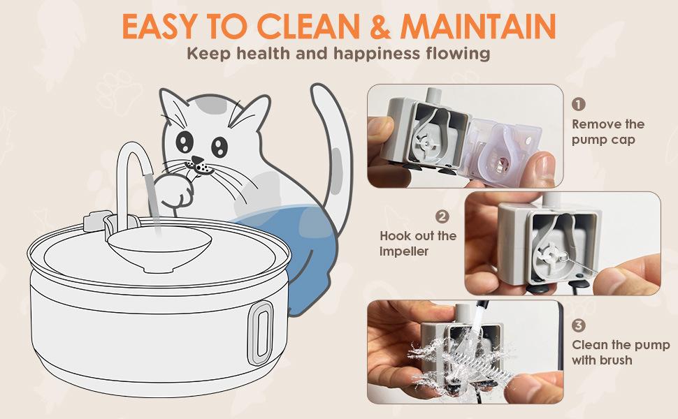 En comparación con las fuentes de agua para mascotas de plástico, las fuentes de agua para gatos de acero inoxidable tienen una resistencia superior a la corrosión y a las altas temperaturas. Brindan a tu mascota una sensación cómoda y di adiós al mentón negro. Excepto por la bomba, las partes principales son aptas para lavavajillas, lo que facilita la limpieza y el mantenimiento de la fuente de agua automática para perros. Reemplaza el filtro y limpia la fuente cada 1-2 semanas.