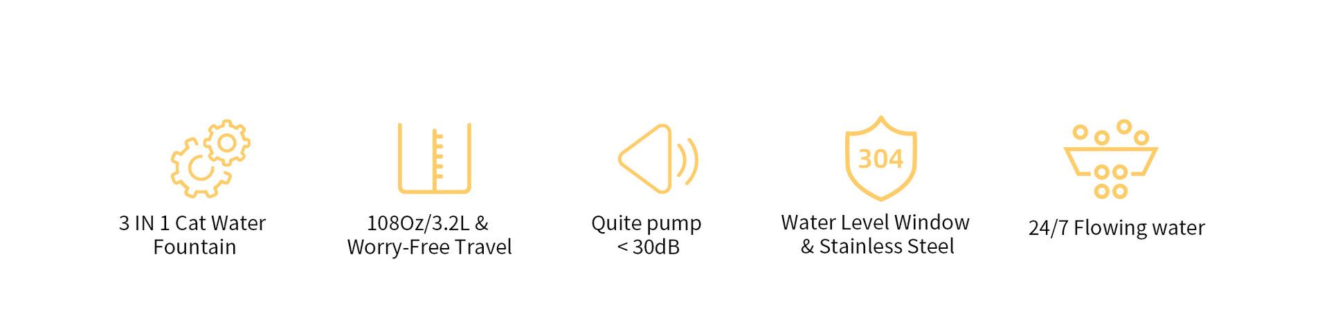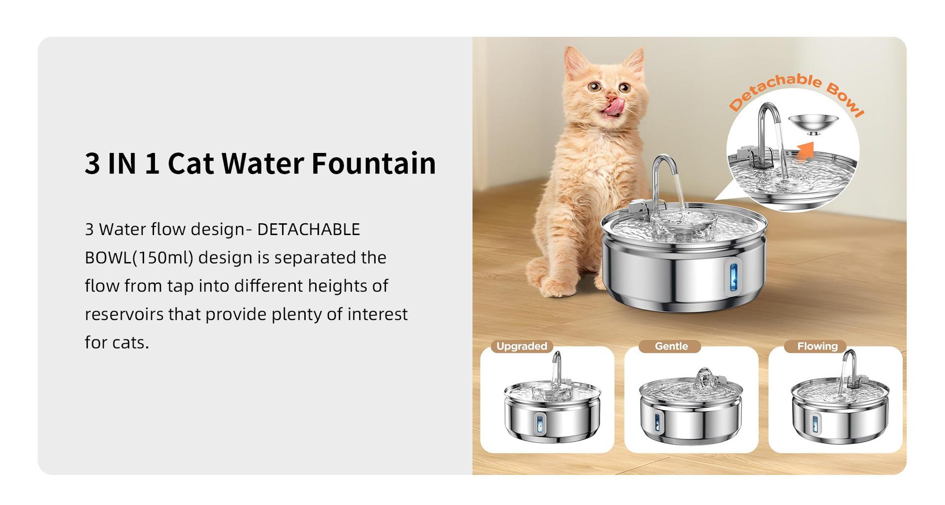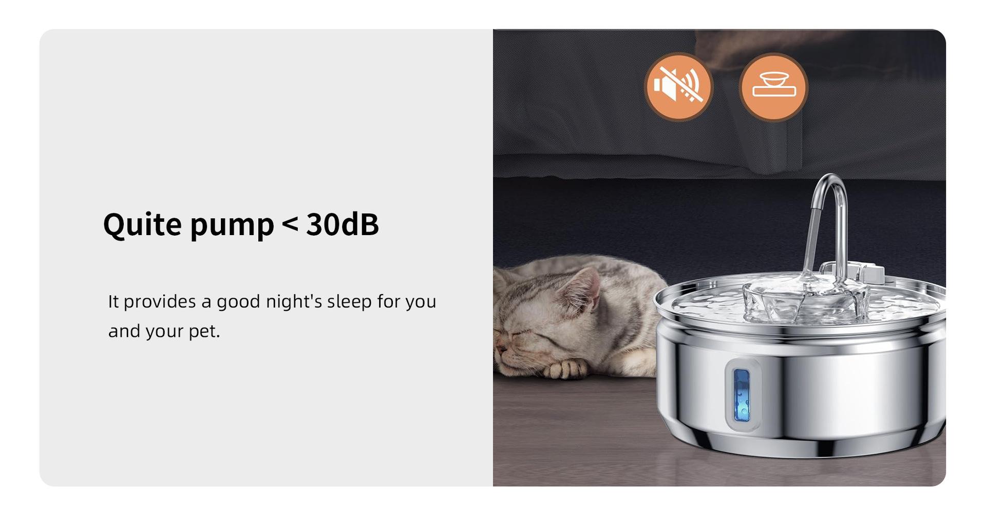 La fuente de agua para gatos de interior combina una BOMBA ULTRA SILENCIOSA de 5V ≤28dB con un tazón desmontable especialmente diseñado para reducir el ruido durante el funcionamiento, proporcionando un buen descanso nocturno para usted y su mascota.
