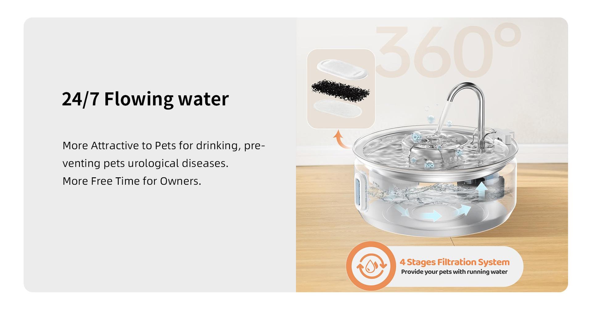 El filtro del dispensador de agua para gatos utiliza algodón filtrante de alta densidad, carbón activado y una esponja prefiltro en la bomba, formando un sistema de filtración cuádruple, que puede atrapar suciedad y pelo, eliminar cualquier olor desagradable y suavizar el agua dura, creando un suministro constante de agua corriente pura que apelará a los instintos de los gatos y refrescará su cuerpo. ¡Nuestra fuente para mascotas vendrá con tres filtros de repuesto, para que ya no te preocupes de que tu gato se deshidrate!