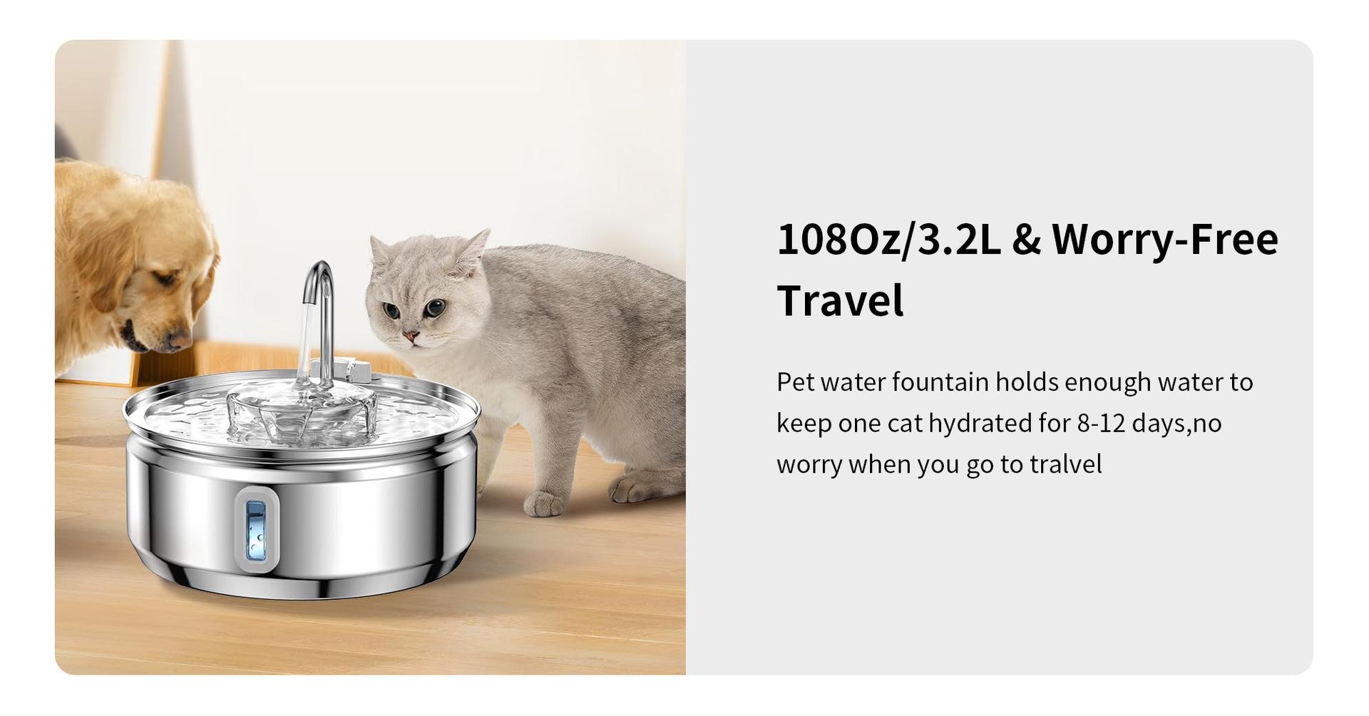 Con una gran capacidad de 3.2L, nuestra fuente de agua para mascotas contiene suficiente agua para mantener a un gato hidratado durante 8-12 días, y es fácil ver el nivel de agua a través de la ventana con luz LED en el frente. No le digas a tu gato, este dispensador de agua para perros es lo suficientemente grande para ser usado por perros también.