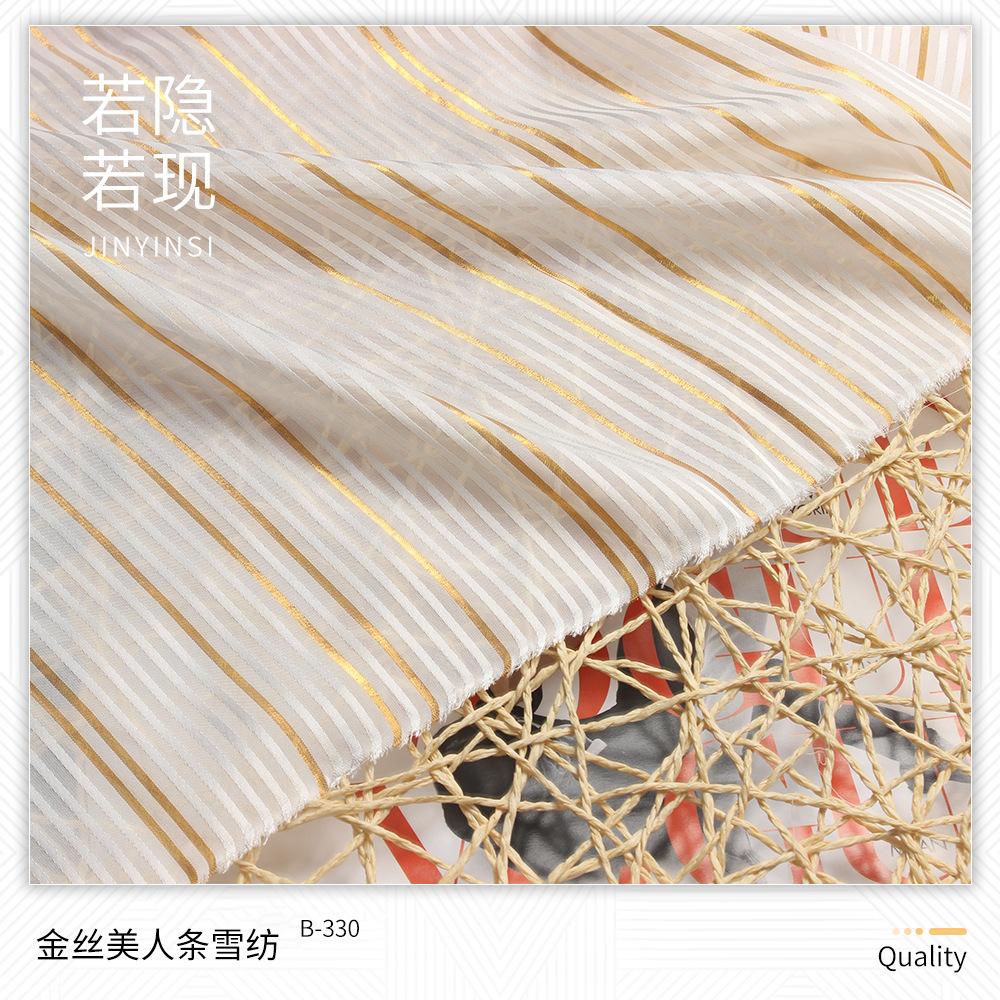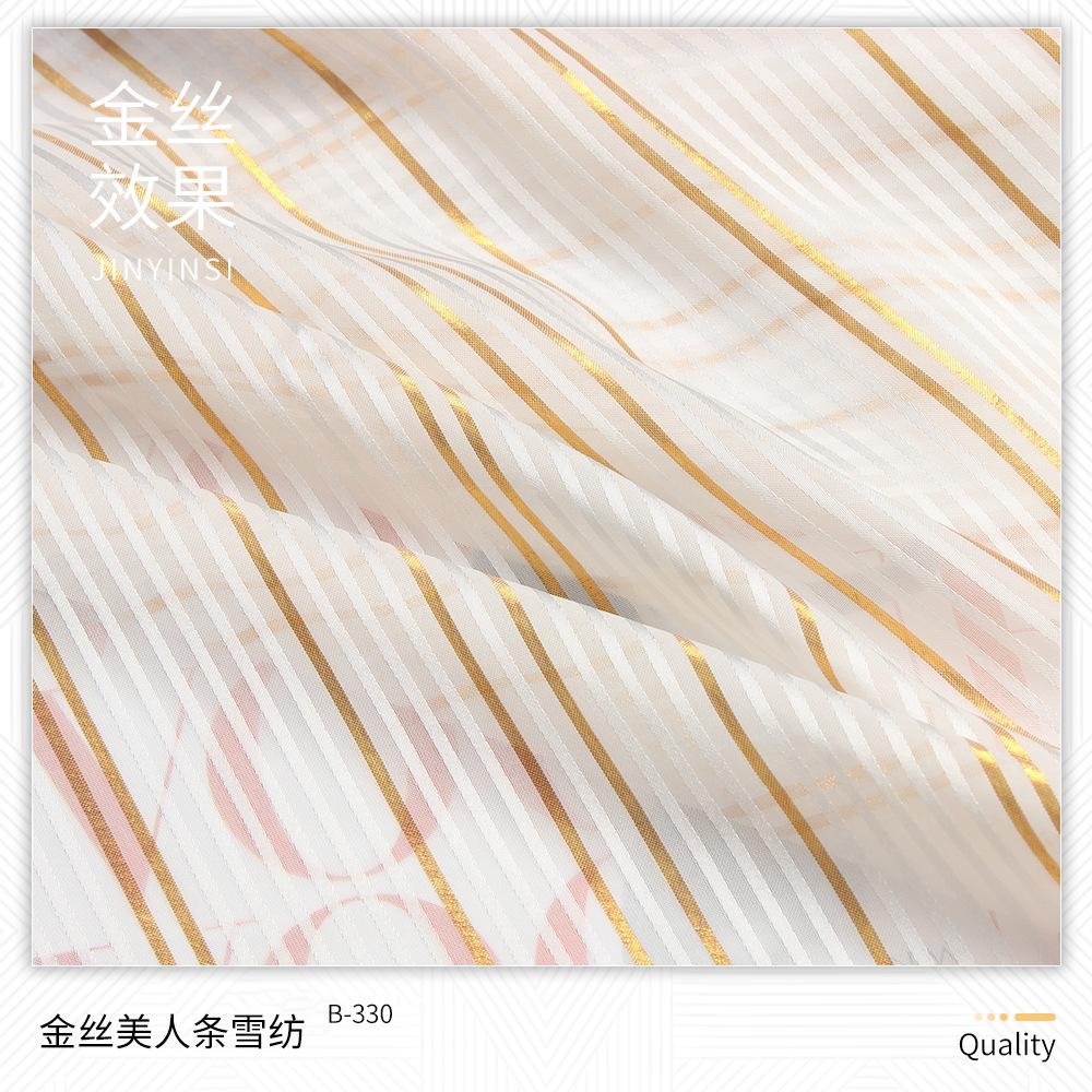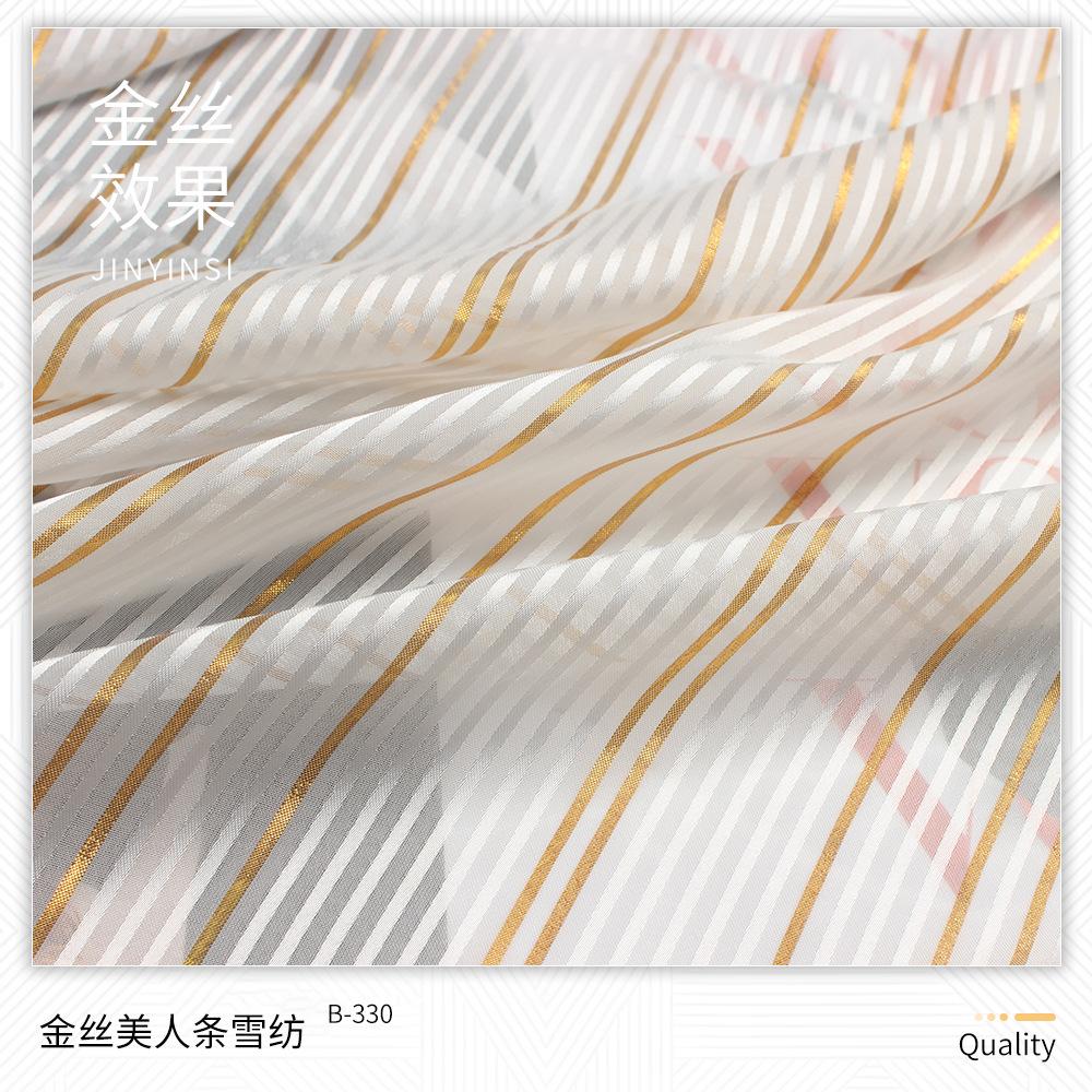 | B-223 | Crepe Shunyu de celosía de seda colorida | B-405 | Crepé de gasa con rayas de belleza plateada | B-528 | Flores de corte largo con alambre de oro y plata CEY | B-712 | Jacquard dorado con lino tejido |