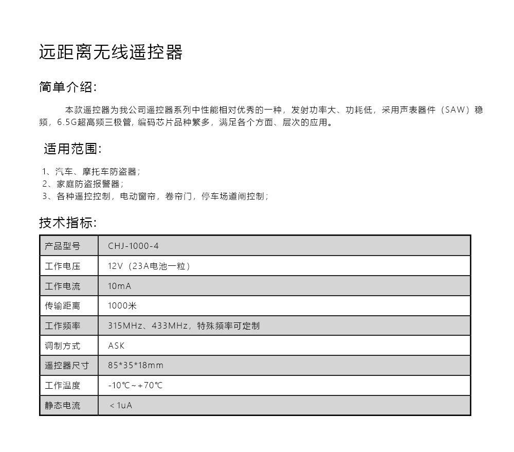 Shenzhen Chenjie Electronics Co., Ltd. es una empresa nacional de alta tecnología establecida en 2003, que integra I+D, producción, ventas y servicio durante 15 años. La empresa cuenta con más de 100 personas, incluyendo muchos ingenieros de software de RF inalámbrica del equipo senior de I+D. Es una empresa profesional especializada en la I+D y producción de productos antirrobo para hogares inteligentes como mandos a distancia para puertas de garaje, mandos a distancia para coches, controladores remotos para lámparas LED, mandos a distancia RF 2.4G, detectores infrarrojos, alarmas de seguridad, etc.