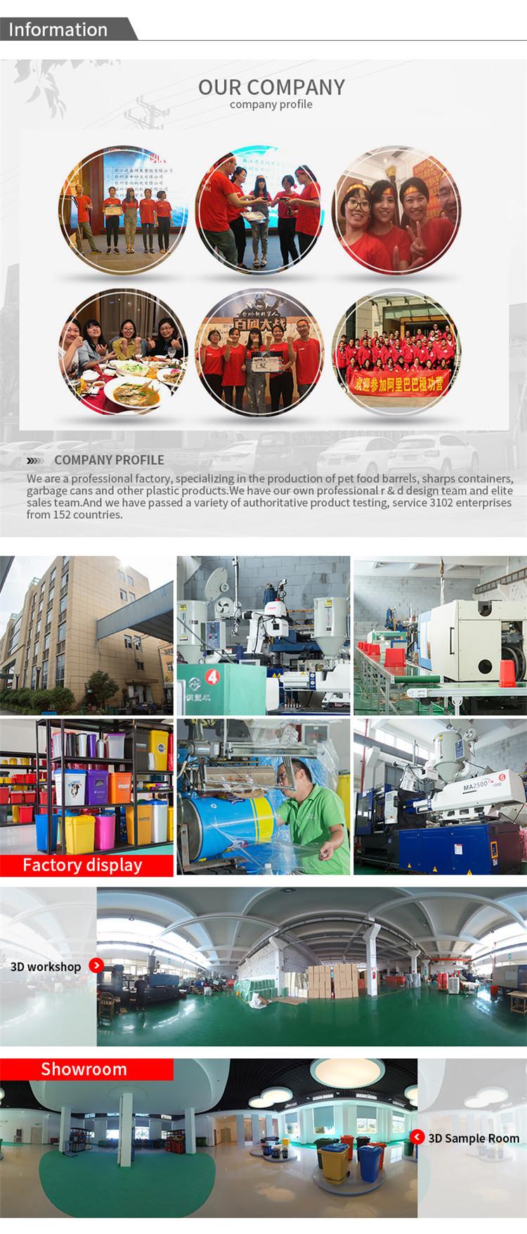Nuestra fábrica se especializa en la producción de barriles para comida de perro, contenedores para objetos punzocortantes, botes de basura, etc. Contamos con nuestro propio equipo de I+D de productos y moldes de producción, sirviendo a 3,105 proveedores en 152 países. Bienvenidos a nuestra fábrica para negociar.
