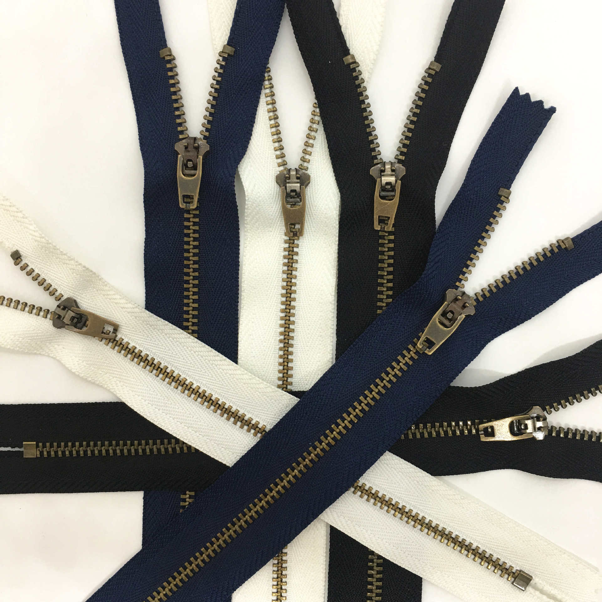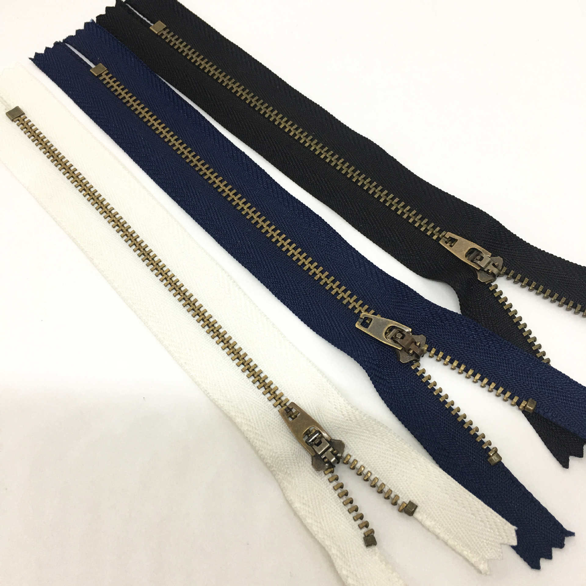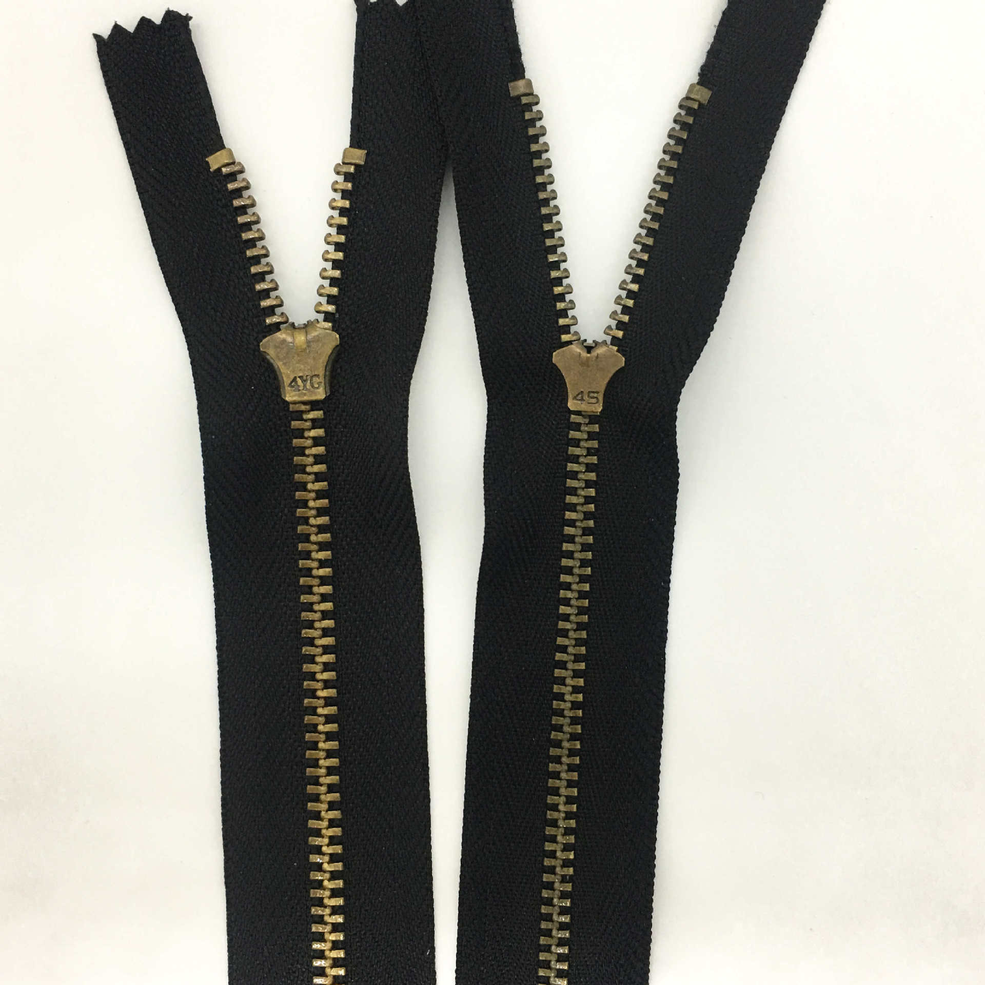 Fábrica al por mayor No. 3 y No. Cremallera metálica de 4 dientes en bronce resistente al lavado con cierre de resorte y cierre de solapa para jeans.
