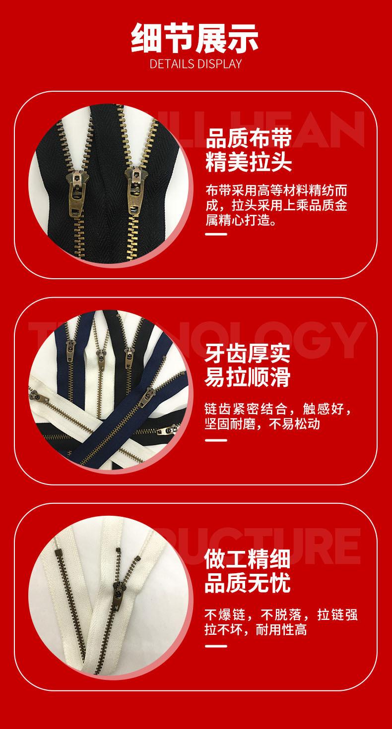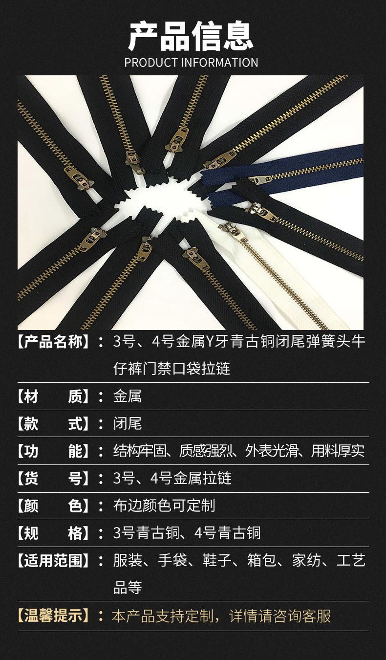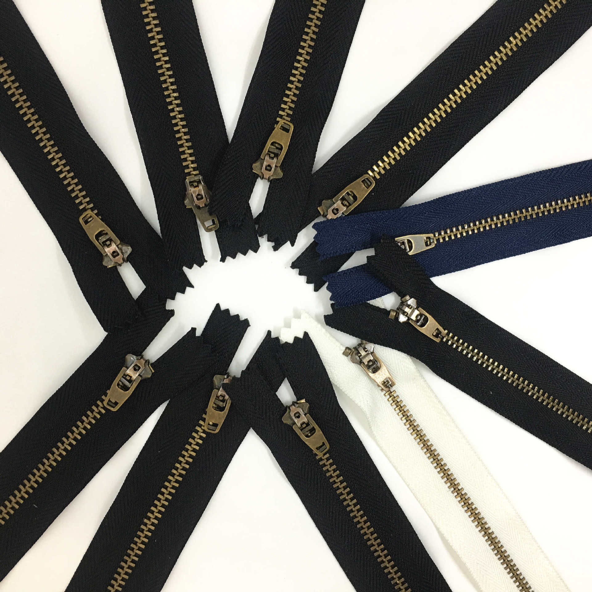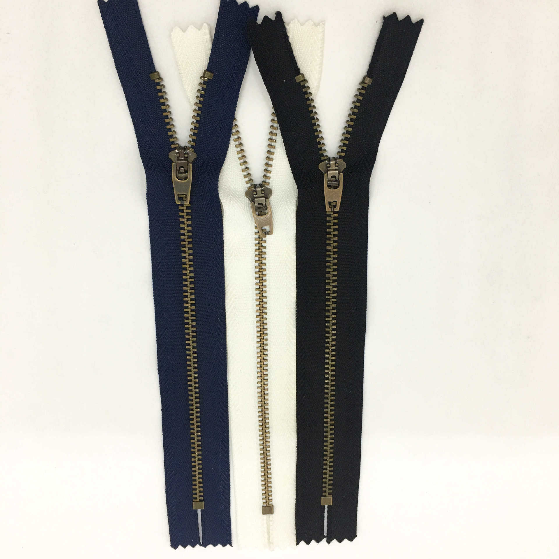 Fábrica al por mayor No. 3 y No. Cremallera metálica de 4 dientes en bronce resistente al lavado con cierre de resorte y cierre de solapa para jeans.