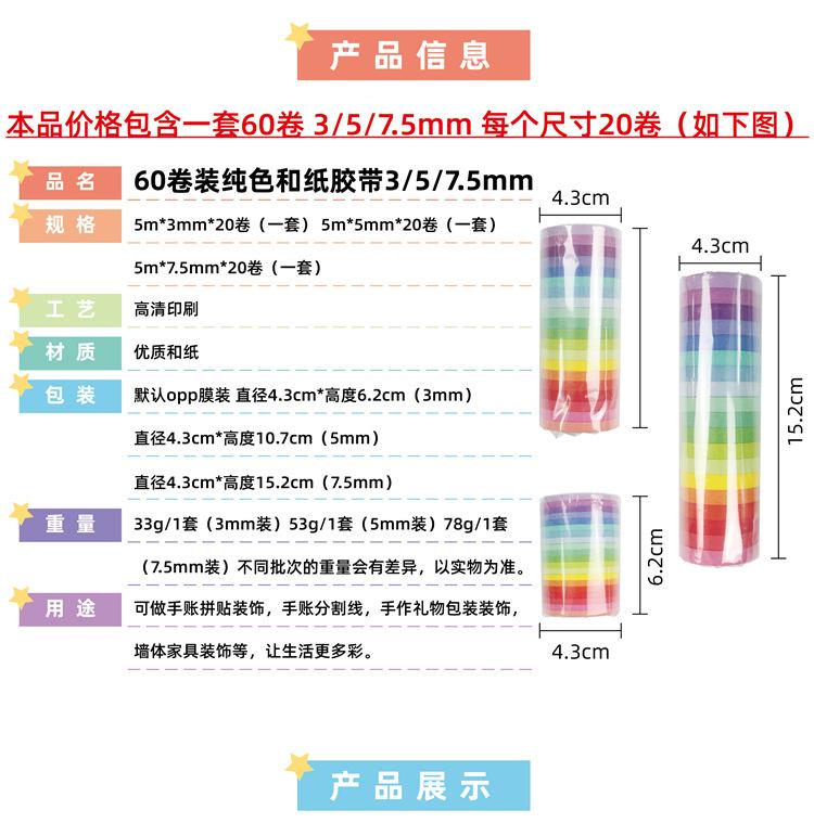 Suministro de Comercio Exterior: 60 Juegos de 5m Cinta Washi de Color Sólido Básico, 20 Colores de Cinta para Journaling, Stickers Transfronterizos para Journals