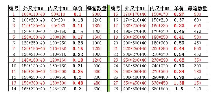 número de serie | Dimensiones externas (mm) | Tamaño interior MM | precio unitario | piezas/caja | número de serie | Dimensiones externas (mm) | Tamaño interior MM | precio unitario | piezas/caja | |