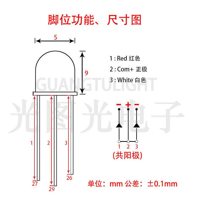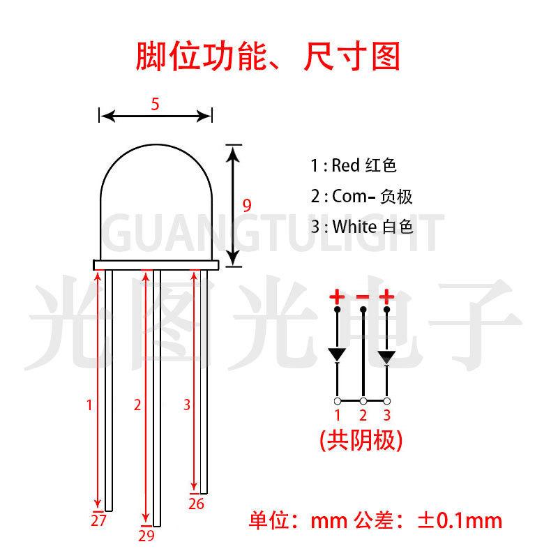 LED bicolor rojo y blanco F5MM en línea, perla LED de cabeza redonda transparente mate, co-ánodo co-cátodo alto brillo 3 pines