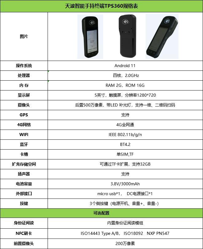 Tianbo Inteligente TPS360Terminal portátil de reconocimiento de tarjetas de identificaciónAdmite función de lectura de tarjetas NFC e ID (opcional), verifica con precisión la información de la tarjeta de identificación de segunda generación y puede aplicarse a escenarios comerciales como policía móvil, campus seguro, comunidad inteligente, transporte inteligente y finanzas inteligentes.