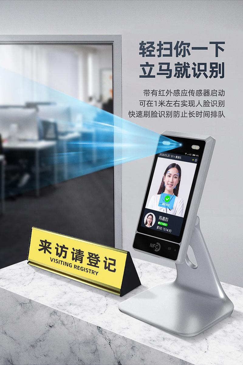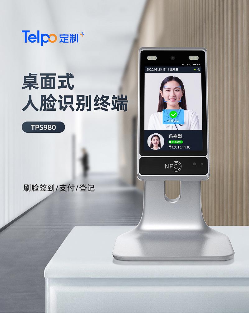 El terminal de reconocimiento facial de escritorio para visitantes TPS980 desarrollado por Telpo Intelligent Hardware tiene una CPU de seis núcleos incorporada y funciona con un sensor infrarrojo. Los usuarios pueden realizar el reconocimiento facial a una distancia de aproximadamente 1 metro. También utiliza una cámara monocular de amplio rango dinámico con luces de relleno duales para localizar y capturar con precisión las características biométricas, realizar rápidamente el reconocimiento facial y el registro facial realmente libera las manos del personal de recepción.