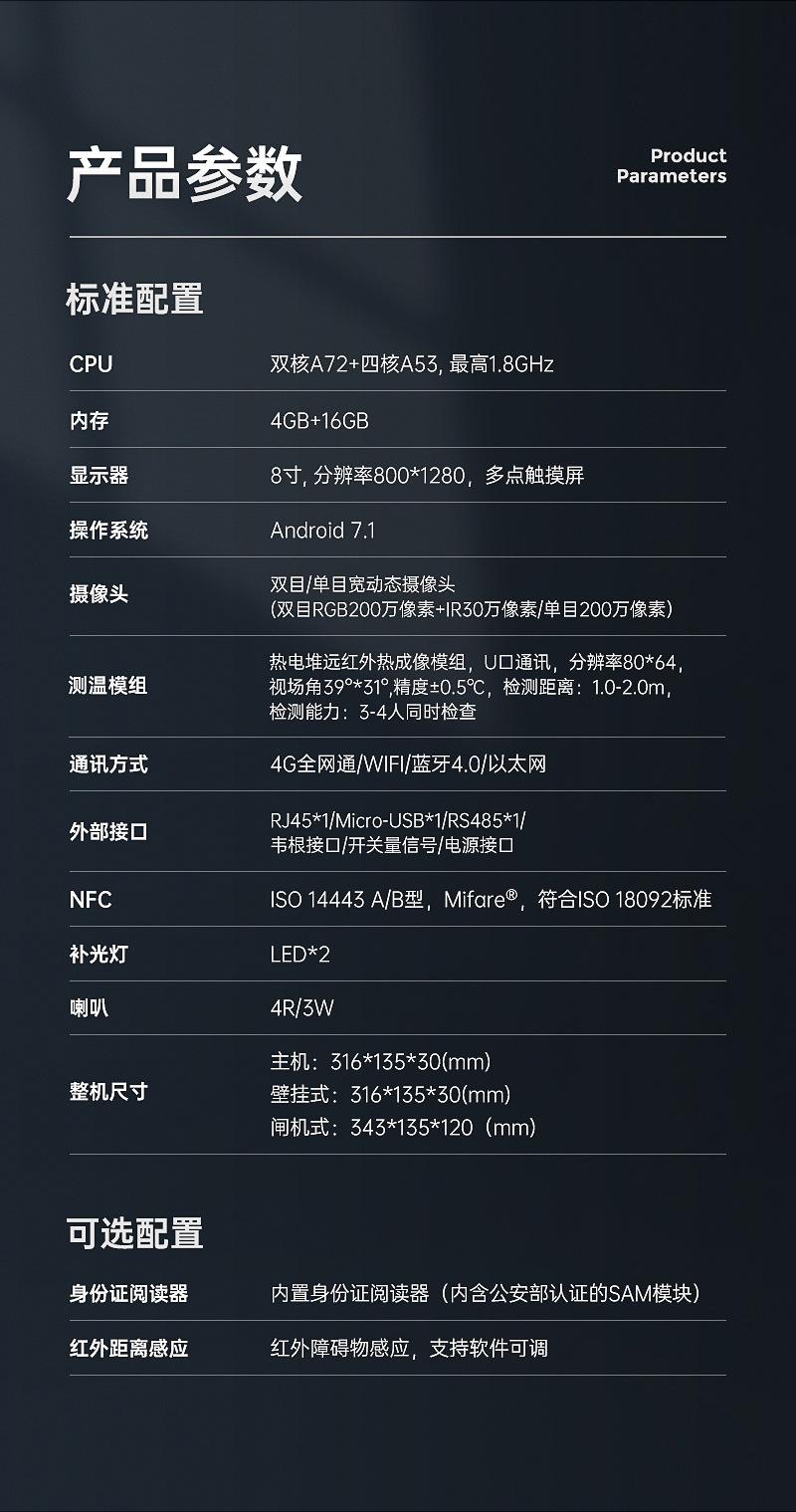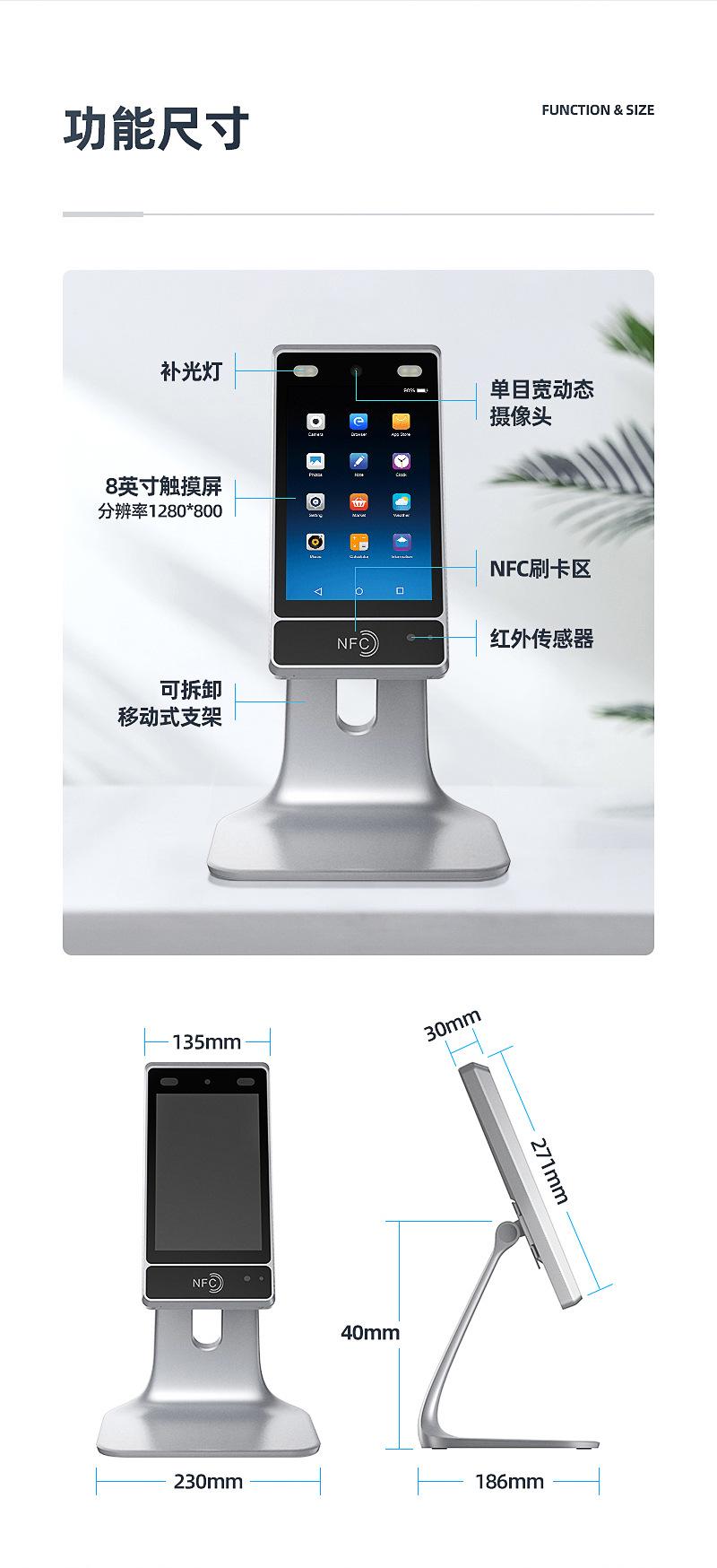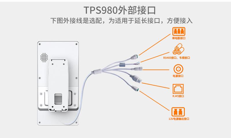 El terminal de reconocimiento facial de escritorio TPS980 es un terminal de reconocimiento facial de escritorio desarrollado por Telpo Intelligent Hardware. El sistema Android admite desarrollo y acoplamiento secundarios, placa base integrada de grado industrial, solución de chip RK3399 a bordo, CPU de seis núcleos a 1.8 GHz, pantalla táctil externa de 8 pulgadas, solución de memoria grande integrada de 4G RAM + 16G ROM, cámara monocular de amplio rango dinámico integrada, equipada con luces de relleno duales, reconocimiento preciso por la noche y admite acceso de red completa 4G/WIFI/Bluetooth/Ethernet. Además, se pueden configurar opcionalmente acceso de red completa 4G personalizado, función NFC y función de reconocimiento de tarjeta de identificación de segunda generación, lo cual es más conveniente y eficiente.