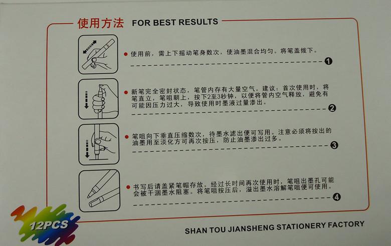 1:Antes de usar, agite el cuerpo del bolígrafo hacia arriba y hacia abajo varias veces para mezclar la tinta dentro del tubo del bolígrafo.