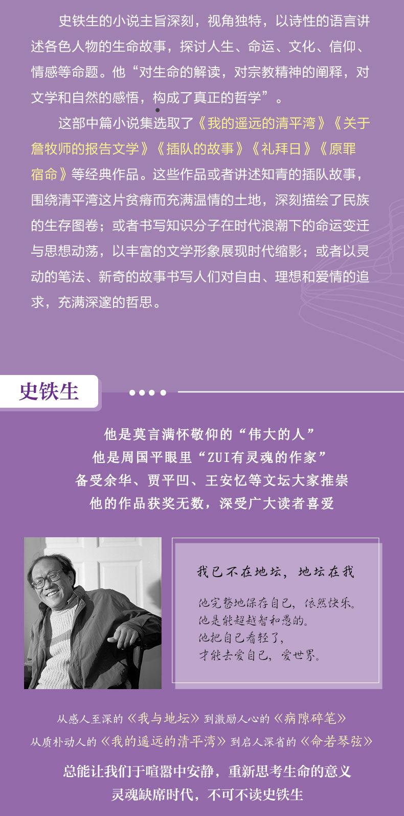 Shi Tiesheng, maestro literario contemporáneo, posee profundas reflexiones, perspectivas únicas y exquisitas estructuras en sus novelas. Narra las historias de vida de diversos personajes con un lenguaje poético y explora las proposiciones de la vida, el destino, la cultura, la fe y la emoción. Su interpretación de la vida, la interpretación del espíritu religioso y la percepción de la literatura y la naturaleza constituyen una auténtica filosofía. Esta colección de novelas selecciona obras clásicas como "Mi distante bahía de Qingping", "Reportaje sobre el pastor Zhan", "Historias de la incorporación al equipo", "Domingo" y "Pecado original y destino". Estas obras narran las historias de jóvenes educados que se unen al equipo, centrándose en la tierra árida y cálida de la bahía de Qingping, y describen con profundidad la supervivencia de la nación; o bien escriben sobre los cambios en el destino y la agitación ideológica de los intelectuales bajo la marea de la época, mostrando el epítome de la época con ricas imágenes literarias; o bien escriben sobre la búsqueda de la libertad, los ideales y el amor por parte de las personas con una escritura inteligente y novelas llenas de profundas reflexiones filosóficas. A través de la estructura única y el lenguaje significativo de las novelas de Shi Tiesheng, siempre podemos sentir la brillantez de la sabiduría y comprender la vida y el destino, la fe y el amor.