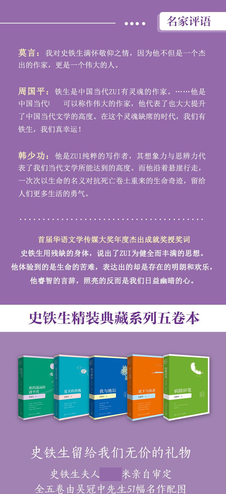 ▲ Tapa dura con hermosas imágenes, imprescindible para coleccionistas: el texto y el apéndice incluyen 10 cuadros de vívidas pinturas de Wu Guanzhong, bellamente impresas a cuatro tintas y realizadas en papel exquisito. ▲ La esposa de Shi Tiesheng, Mi, revisó y corrigió personalmente el libro con esmero. ▲ Shi Tiesheng es uno de los escritores más admirados de la China contemporánea. Su escritura es completamente isomórfica con su vida. Utiliza su cuerpo imperfecto para expresar los pensamientos más profundos y profundos. Experimentó el sufrimiento de la vida, pero expresó la luminosidad y la alegría de la existencia. Sus sabias palabras iluminan nuestros corazones cada vez más oscuros. —— Discurso de premiación para Shi Tiesheng, ganador del Premio a la Excelencia en los Primeros Premios de Literatura China. ▲ Conocido como el "escritor más puro", "su imaginación y pensamiento crítico representan las alturas que nuestra literatura contemporánea puede alcanzar"; "utilizó su propio sufrimiento para enriquecer la comprensión de la vida de todos, etc."