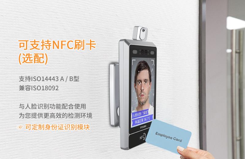 La máquina integrada para visitantes con reconocimiento facial inteligente y medición de temperatura TPS980 de Telpo puede admitir la función personalizada de lectura de tarjetas NFC, es compatible con el tipo ISO14443 A/B y es compatible con ISO18092. El Telpo TPS980 se puede personalizar para utilizar el reconocimiento de identidad híbrido, combinando la función de lectura de tarjetas de identificación de segunda generación con la función de reconocimiento facial para proporcionar a los usuarios un entorno de detección y reconocimiento más eficiente.