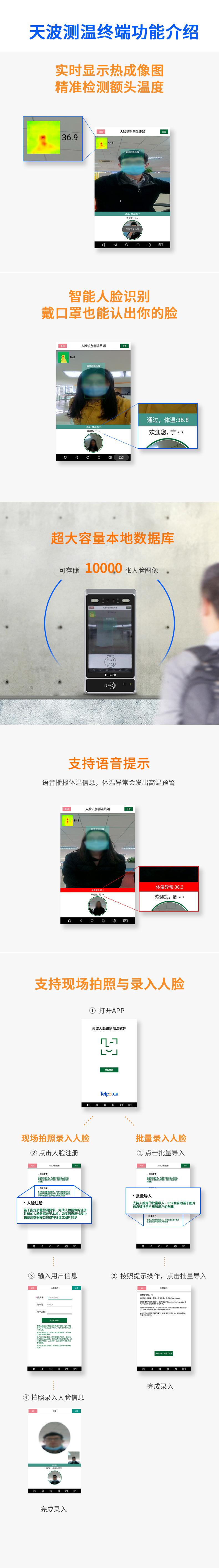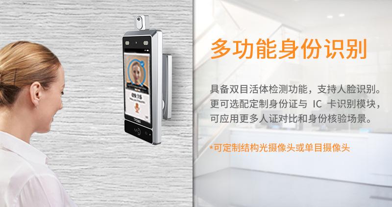 El terminal para visitantes con reconocimiento facial y medición de temperatura TPS980 desarrollado por Telpo Intelligent Hardware puede realizar el reconocimiento de identidad multifuncional. Se activa mediante un sensor infrarrojo. Los usuarios pueden realizar el reconocimiento facial a aproximadamente 1 metro. Integra una cámara binocular de amplio rango dinámico, tiene función de detección de vivacidad binocular y está equipado con luces de relleno duales. Puede localizar y capturar con precisión las características biométricas, realizar rápidamente el reconocimiento facial, y el registro facial puede liberar verdaderamente las manos de la recepción. Se pueden configurar opcionalmente módulos personalizados de reconocimiento de tarjetas de identificación y tarjetas IC, que se pueden aplicar a más escenarios de cualquier comparación funcional y verificación de identidad.