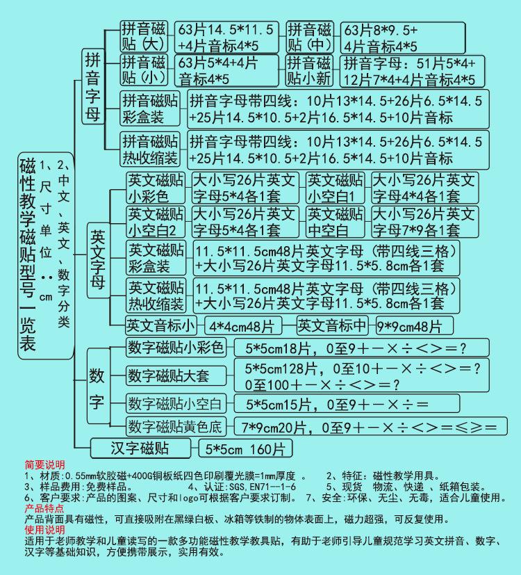 Consonantes iniciales: 23 hojas Vocales simples: 6 hojas Vocales complejas: 18 hojas Sílabas generales: 16 hojas Tabla Pinyin 1 hoja Tarjetas para escribir en tres renglones: 1 hoja Tarjetas de tonos 6 juegos Especificaciones: 5.5*9.5CM/8*9.5CM/12*9.5CM