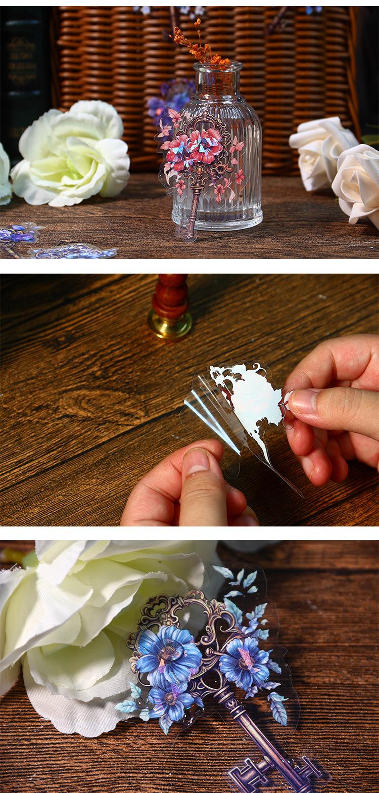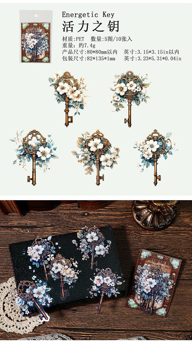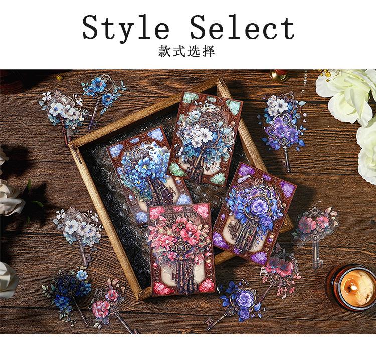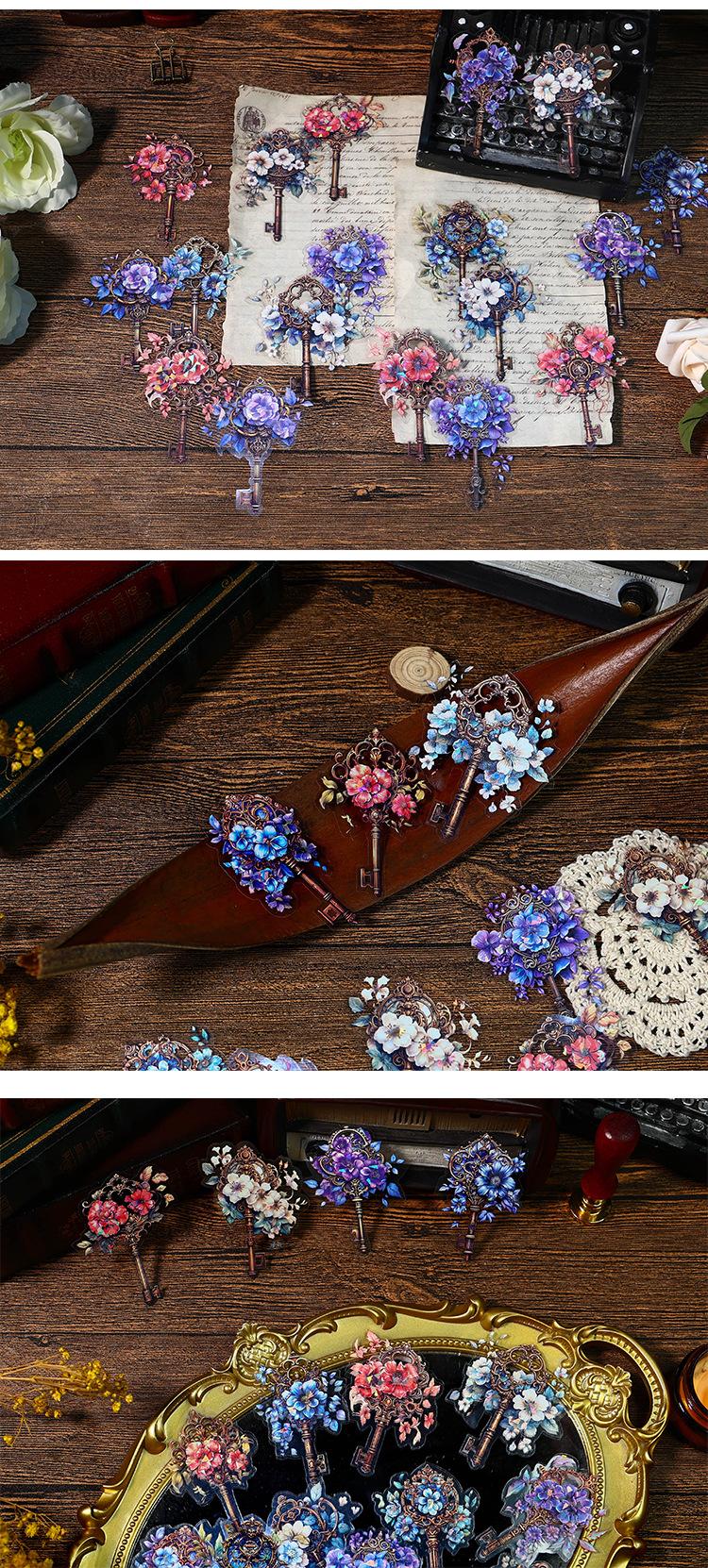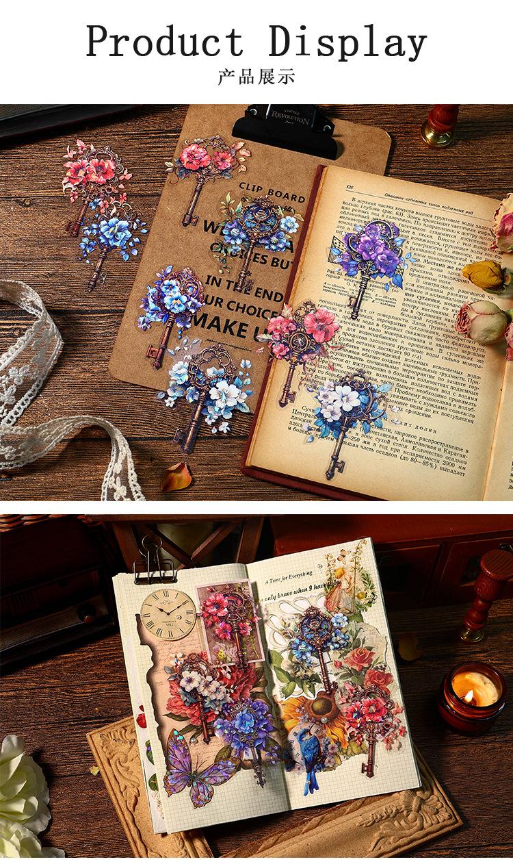 Serie de flores y llaves de bosque antiguo transfronterizo con encaje vintage, pegatinas para diario, decoración de collage de diario de mascotas