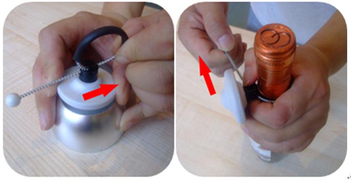 También se puede usar para proteger otros productos con áreas perforadas, como bolsas. Para desbloquear el cierre magnético, extraiga completamente la brida (para los modelos con rótula, primero debe quitar la rótula), insértela en el orificio de fijación y luego inserte la brida en el cabezal de aluminio para bloquearla.