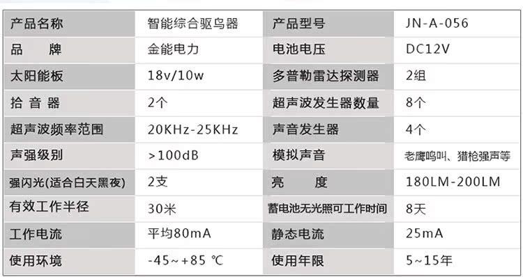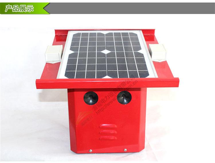 Este producto es el repelente ultrasónico de aves JN-PUW, que utiliza voz inteligente para repeler aves. Repele a las aves imitando el llamado de las águilas. Este producto es adecuado para líneas eléctricas, aeropuertos y otros lugares. El avanzado repelente inteligente de aves genera electricidad a través de energía solar. Cuando está nublado, llueve o no hay sol, su batería de almacenamiento puede usarse durante 10 días.