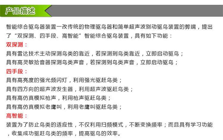 El repelente de aves ultrasónico inteligente por voz tiene funciones ultrasónicas, de voz, estroboscópicas y otras. El repelente de aves detecta aves que se acercan al área de detección a través de micrófonos y radares, envía ondas ultrasónicas y simula sonidos de águila y escopeta para intimidar a las aves que se acercan, y también puede usar luz estroboscópica para estimular el sistema visual del ave por la noche, alejando así eficazmente a las aves. El dispositivo se alimenta con baterías solares y funciona las 24 horas del día mediante energía solar, lo que lo hace completamente adecuado para su uso en la mayor parte del país.
