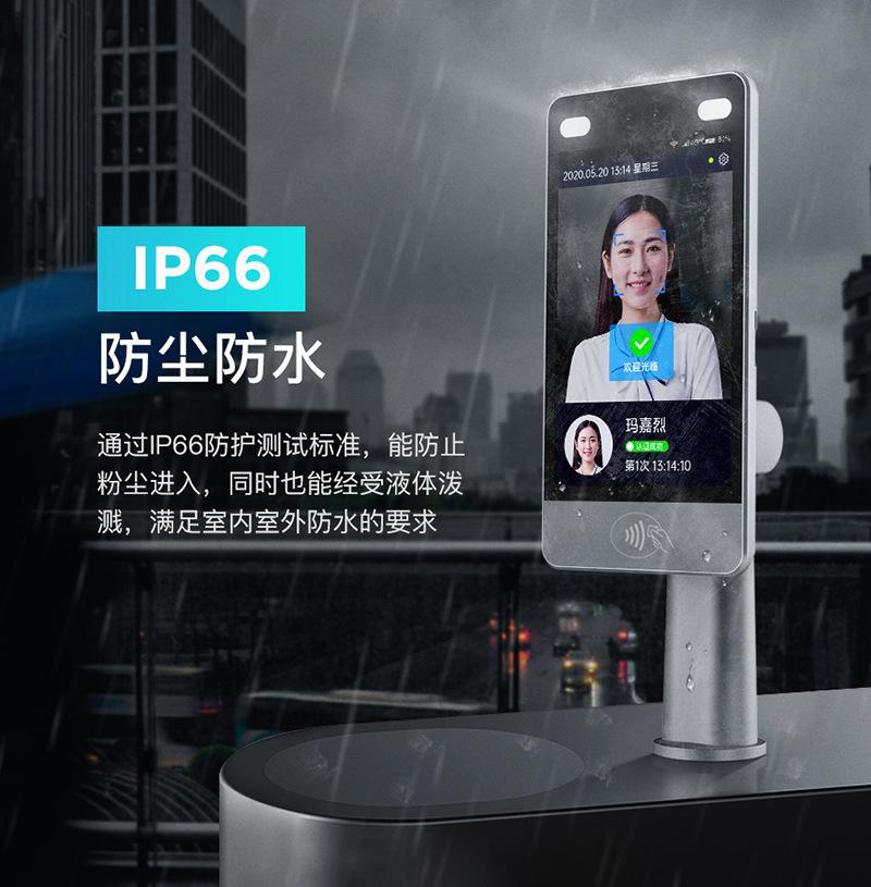 El terminal de reconocimiento facial Telpo F8L ha superado la prueba de protección IP66, es resistente a la entrada de polvo y a las salpicaduras de líquidos, cumpliendo con los requisitos de diversos entornos, especialmente las exigentes operaciones al aire libre. Está equipado con cámaras binoculares RGB e IR, es compatible con entornos con luz frontal y contraluz intensa, y tiene una precisión de reconocimiento facial del 99,8 %. Cuenta con intercomunicador de audio y video, lector de tarjetas y cuenta con un grado de impermeabilidad IP66. Además, funciona de forma estable en exteriores y es ideal para escenarios como hoteles, oficinas, campus y supermercados inteligentes.