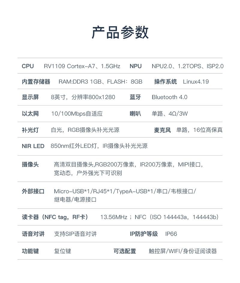 El nuevo terminal de control de acceso con reconocimiento facial integrado F8L de Guangdong Tianbo Intelligent Hardware incorpora la solución RV1109 y un sistema Linux. Se trata de un terminal de control de acceso inteligente basado en una aplicación de algoritmo de reconocimiento facial, desarrollado y producido independientemente por Guangdong Tianbo. Utiliza un algoritmo avanzado de reconocimiento facial y se integra con una cámara binocular para identificar rostros con rapidez y precisión, proporcionando una plataforma de hardware para el funcionamiento del algoritmo de reconocimiento facial. Sus potentes recursos de hardware garantizan la eficiencia del funcionamiento y el cálculo del algoritmo de reconocimiento facial.
