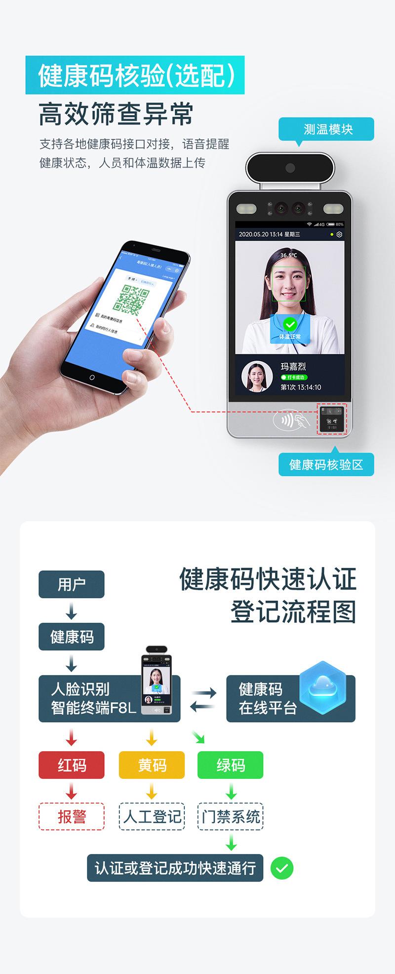 En un momento en que la prevención y el control de epidemias se han convertido en una práctica habitual, los códigos sanitarios se han convertido en un pase para la gestión pública y los organismos de servicios al entrar y salir de comunidades, parques, organismos gubernamentales, hospitales, escuelas, aeropuertos y estaciones de servicio con aglomeraciones. El terminal de control de acceso con código sanitario F8L utiliza el código sanitario de prevención de epidemias para integrar el big data con las necesidades de prevención y control de epidemias en diversos lugares de riesgo. Además, realiza la detección inteligente de temperatura mediante reconocimiento facial, la autenticación del nombre real del documento de identidad y el escaneo del código sanitario nacional para que el personal inspeccionado verifique el acceso. Esto mejora aún más la comodidad de los desplazamientos de los residentes durante la epidemia y utiliza la tecnología para reducir la presión sobre el personal de prevención de epidemias de base.