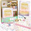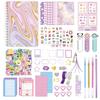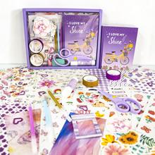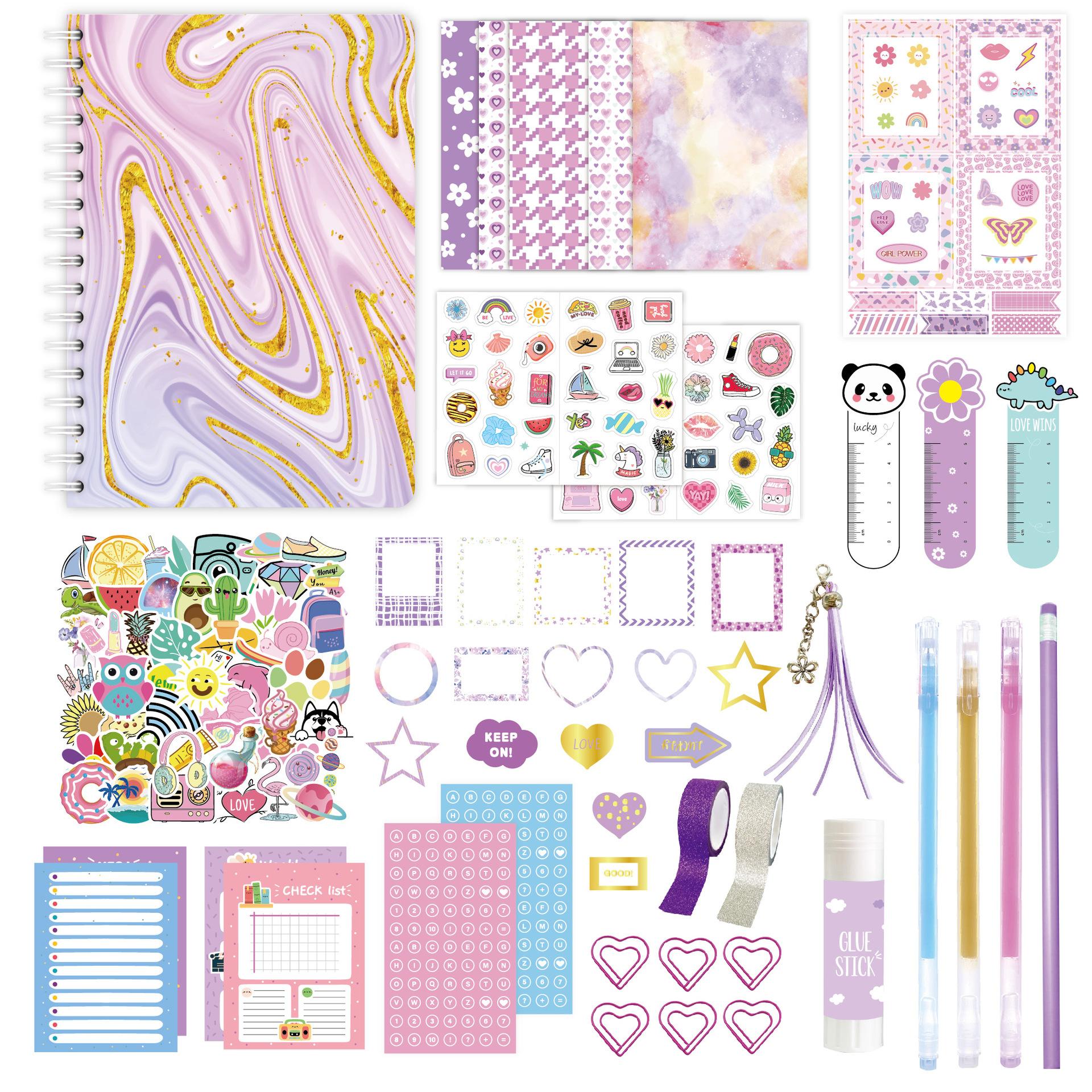 El paquete contiene:1 libreta, 5 páginas de álbum de recortes, 4 hojas de notas para planificar, 2 stickers estilo fresco, 2 stickers marco de fotos, 2 stickers alfabeto, 16 stickers marco de fotos, 3 separadores regla, 6 clips de papel, 51 stickers, 1 barra de pegamento, 2 cintas brillantes, 3 marcadores resaltadores, 1 lápiz, 1 dije de borla