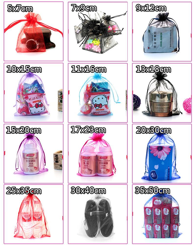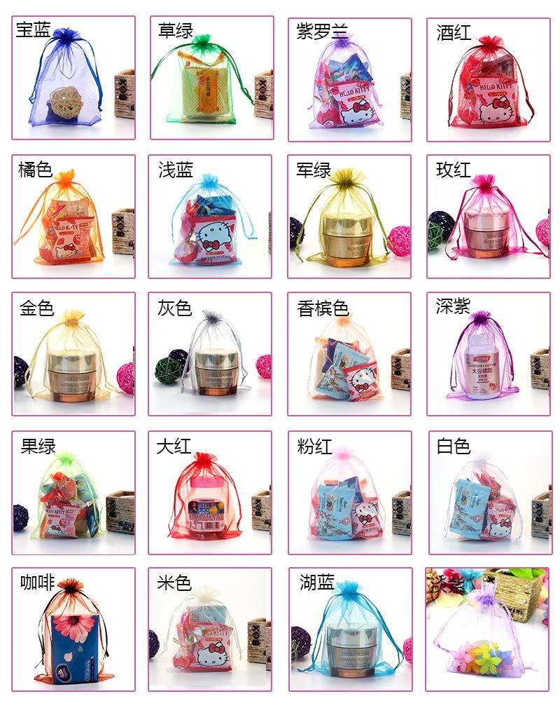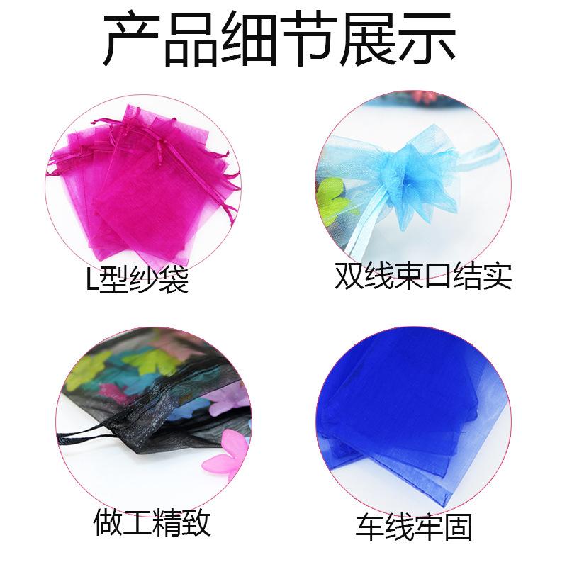 Colores de la bolsa de gasa: blanco, dorado, rojo, azul real, azul lago, verde hierba, rojo rosa, rosa, morado claro, naranja