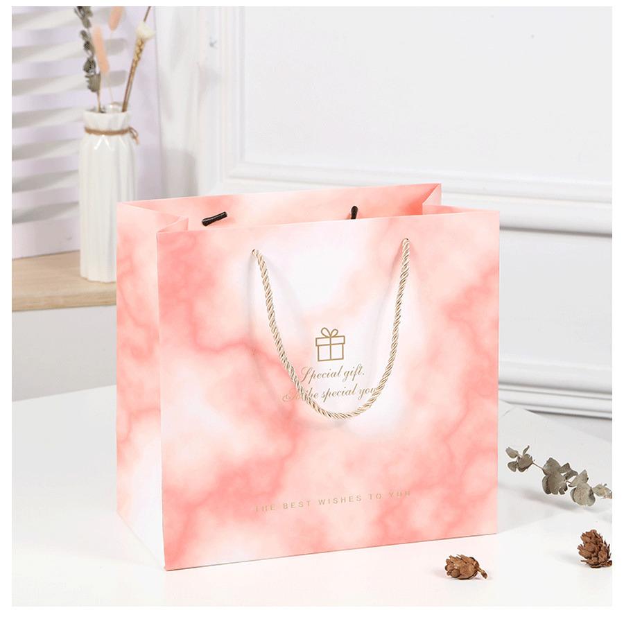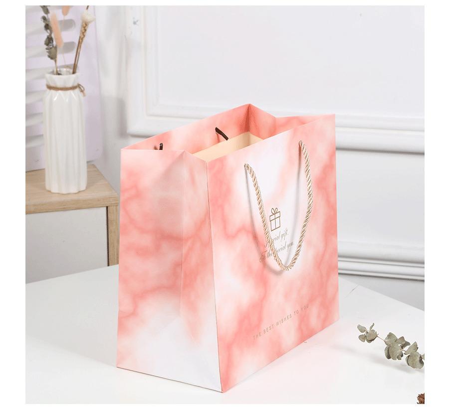 Cartón blanco: El cartón blanco es firme y grueso, con alta rigidez, resistencia al desgarro, suavidad y una superficie plana. El grosor más común es de 210 a 300 gramos, y el más común es el de 230 gramos. Las bolsas de papel impresas en cartón blanco tienen colores vibrantes y una excelente textura, lo que las convierte en la mejor opción para personalizar.