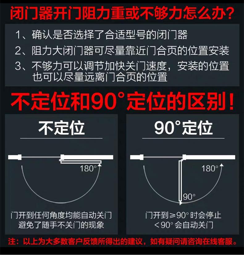 El posicionamiento a 90 grados es una función adicional de la puerta. Cuando se abre a 90-170 grados, la puerta se detendrá y no se moverá. Se necesita un poco de fuerza para empujar la puerta para cerrarla. Sin posicionamiento: la puerta automática de 180 grados se cerrará automáticamente en cualquier ángulo