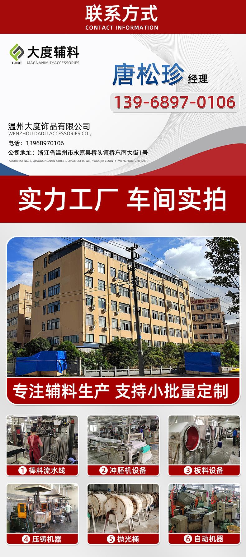 Yongjia County Dadu Garment Co., Ltd. es un fabricante profesional de materiales auxiliares y accesorios de ferretería. La empresa cuenta con sólidas capacidades de procesamiento, rica experiencia en producción y un sólido equipo de marketing. Actualmente, la empresa produce principalmente varios botones de resina, botones metálicos, botones de plástico, botones de urea, botones acrílicos, botones de madera, botones de concha natural, botones de tres velocidades, hebillas de cintura, hebillas, hebillas de resorte, péndulos, botones de perlas, hebillas de placa, hebillas en forma de I, hebillas de calabaza, hebillas ocultas, hebillas cuatro en uno, hebillas de oliva, hebillas de cuerno, cintas, cremalleras, cintas, bandas elásticas, hebillas decorativas, etc.; es una empresa sustancial que integra desarrollo, producción, ventas y comercio. Nuestra empresa puede producir productos que cumplen con los estándares internacionales y satisfacen la satisfacción del cliente según las necesidades del cliente. Siempre seguimos el espíritu corporativo de "calidad primero, servicio al cliente primero", fortalecemos continuamente la gestión interna, expandimos los mercados nacionales y extranjeros, mejoramos la imagen de marca corporativa y nos adherimos al principio de "orientado a las personas, tecnología primero, gestión científica y ganar por calidad" para crear nuevas alturas para la industria de accesorios de confección. |