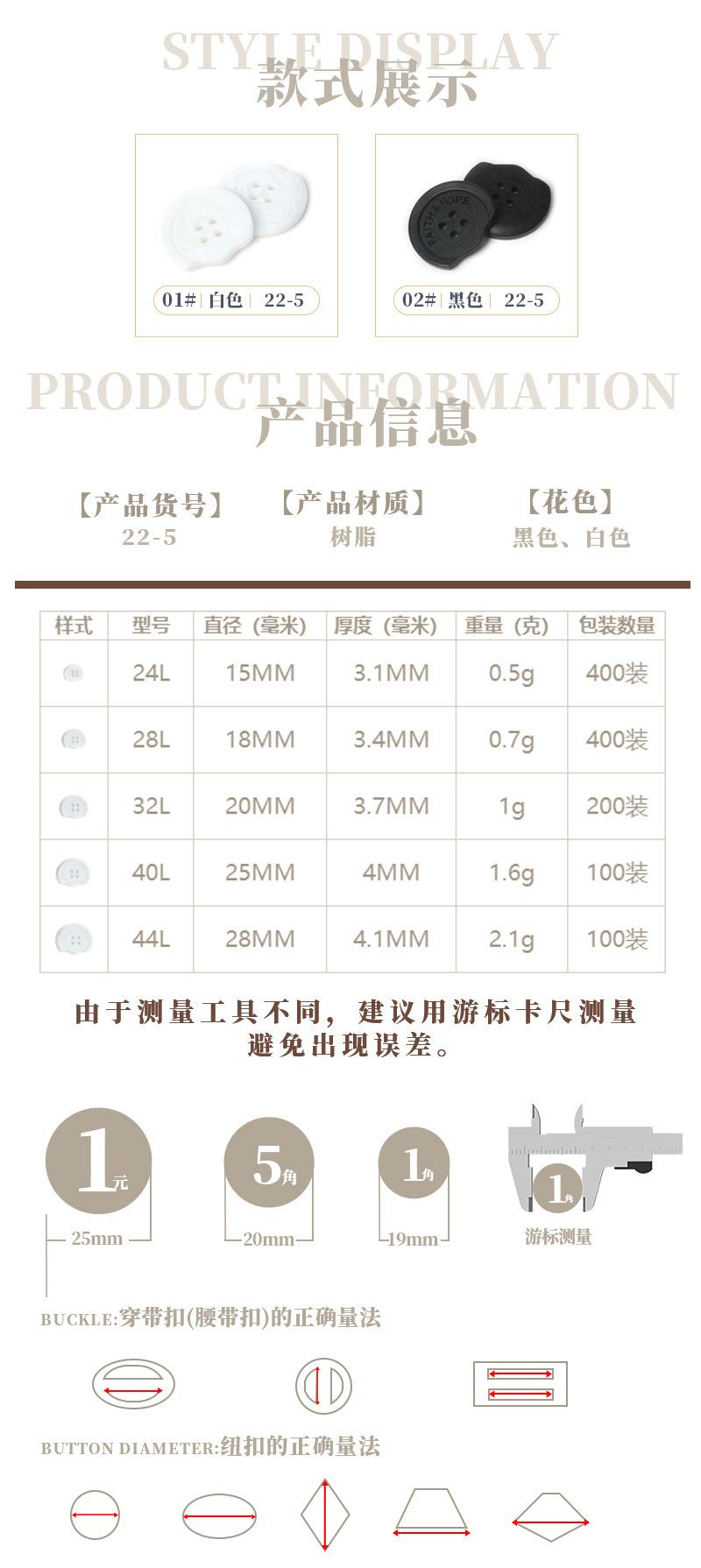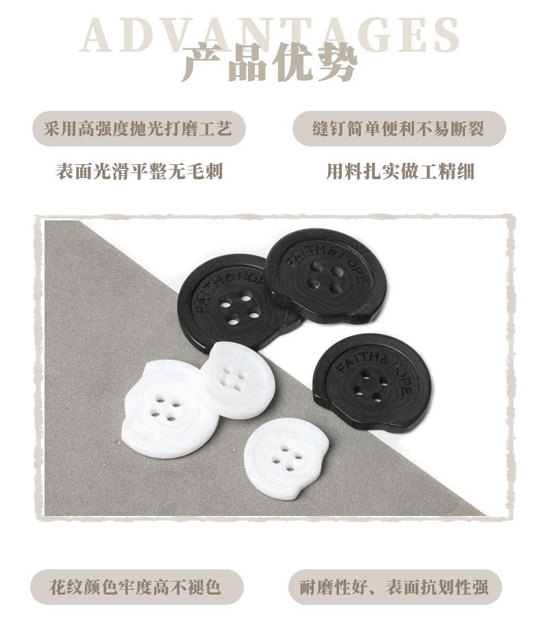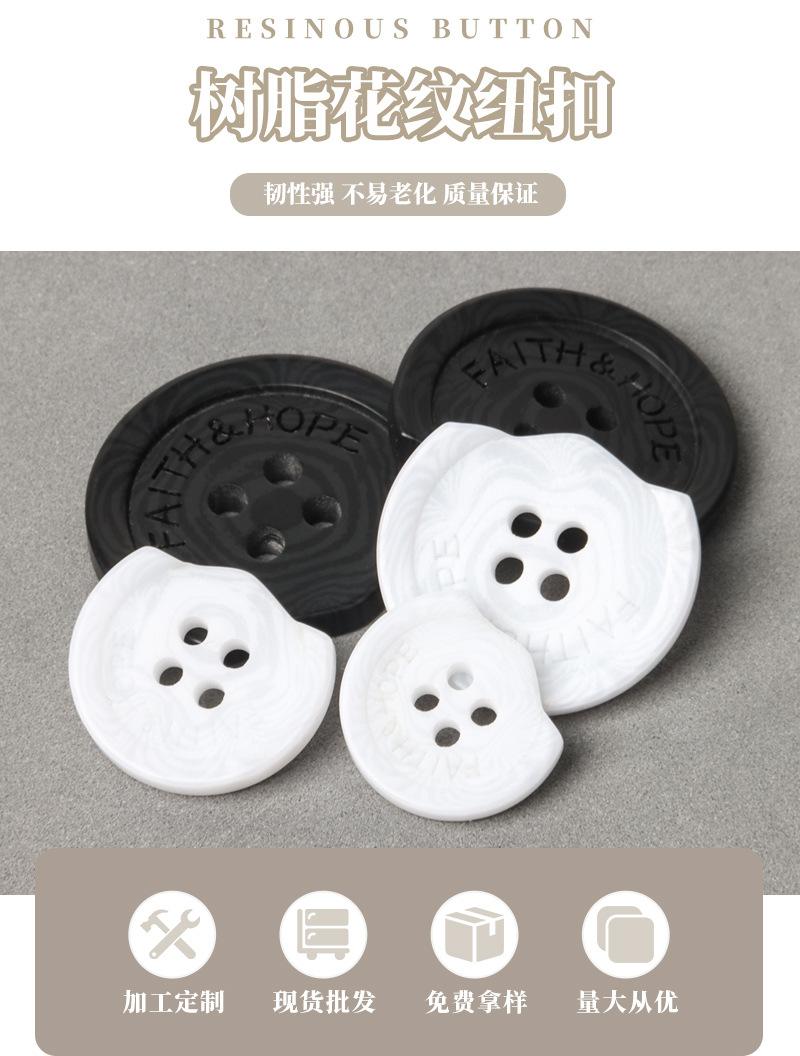 Botones prefabricados de resina con forma especial grabados del fabricante Botones blancos y negros Abrigo Chaqueta Accesorios de ropa Venta al por mayor