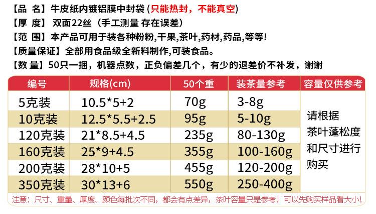 Two taels [21*8 4cm] 100, Four two [25*9 4cm] 100, 0.25kg [28*10 5cm] 100, 0.50kg [30*13 6cm] 100