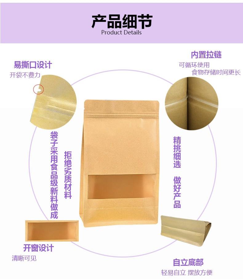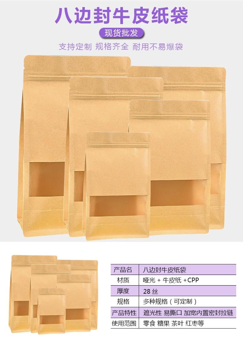 Bolsa de papel Kraft sellada de ocho lados con ventana esmerilada, venta al por mayor, autoportante, con cierre autosellante, para envasado de nueces, té y alimentos