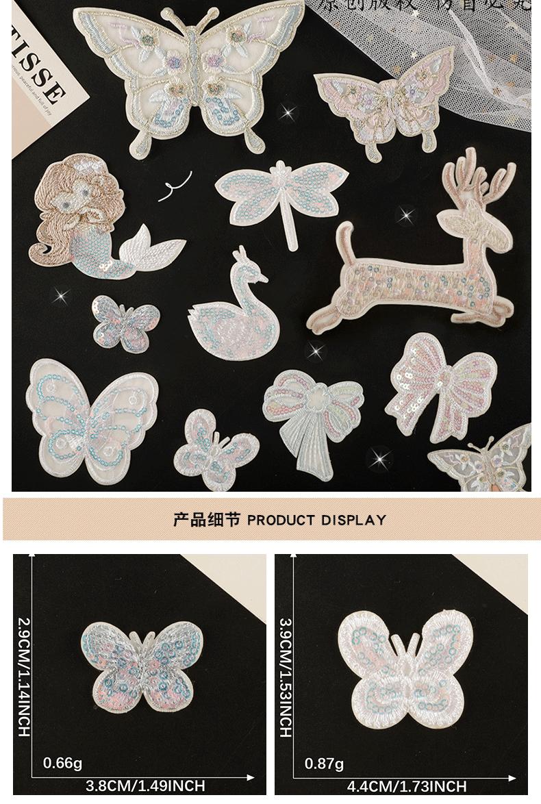 [Nota] Los parches con lentejuelas, cuentas, pedrería, flores de seda, bolas de pelo y bordados con hilo metálico deben plancharse primero por detrás y luego recortarse por delante, una vez fijados firmemente. Esto evitará dañar las lentejuelas u otros accesorios de la parte delantera. Mantenga la ropa (u otros textiles) seca y no rocíe agua sobre los parches de tela ni sobre la ropa con la plancha al plancharlos. Una vez planchado, el parche de tela generalmente se adhiere bien a la ropa (u otros textiles) durante mucho tiempo. Si el parche se desprende después de un tiempo o después del lavado, significa que la temperatura de la plancha es demasiado baja o el tiempo de planchado es demasiado corto. Puede repetir la operación original y planchar el parche de nuevo.