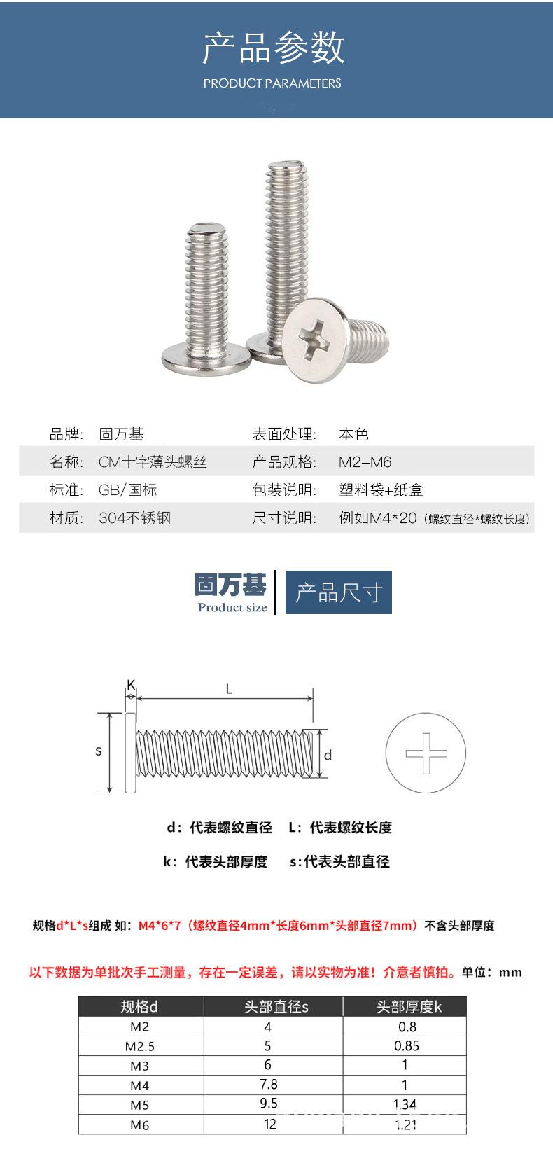 Tornillos de Cabeza Delgada de Acero Inoxidable 304 Cabeza Plana Grande Cabeza Plana Cruz Máquina Alambre Tornillos de Cabeza Plana M2M2.5M3M4M5M6