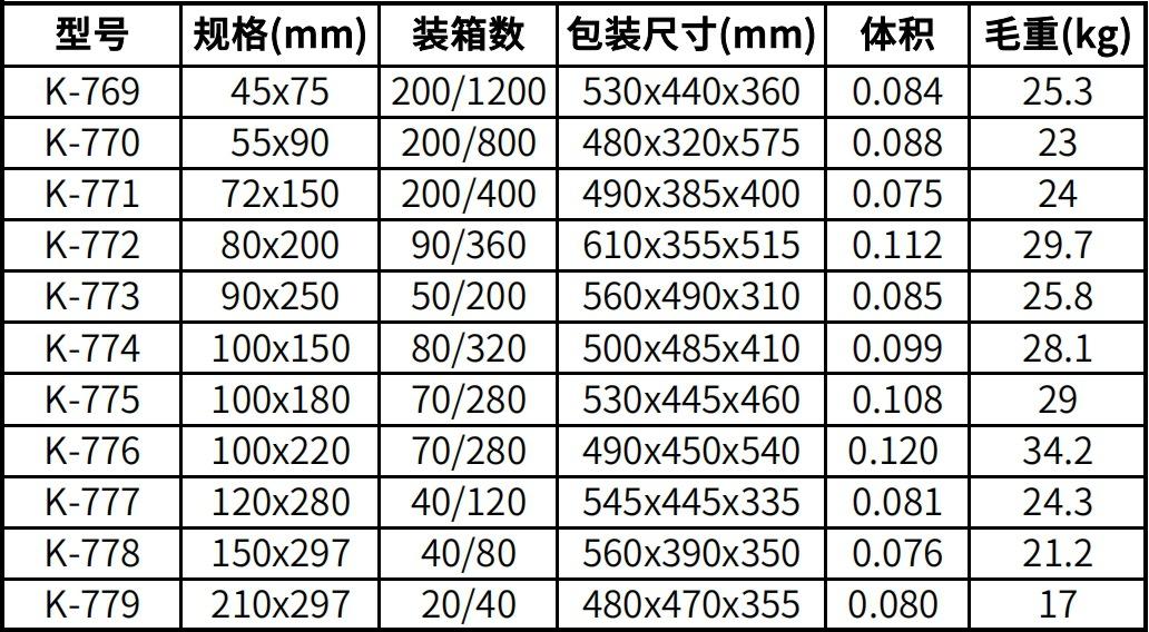 K-769 1200 pcs/box, K-770 800 PCs/box, K-771 400 PCs/box, K-772 360 PCs/box, K-773 200 PCs/box, K-774 320 PCs/...