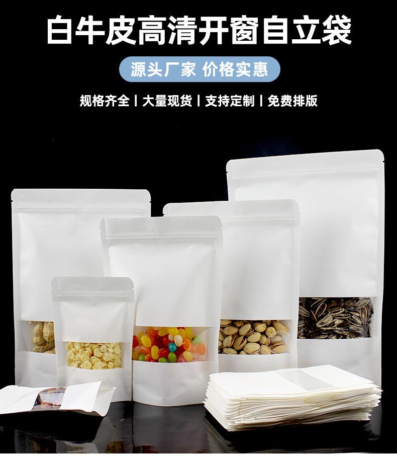 White kraft paper HD window self-standing bag full set of samples; White kraft paper/PET/CPP